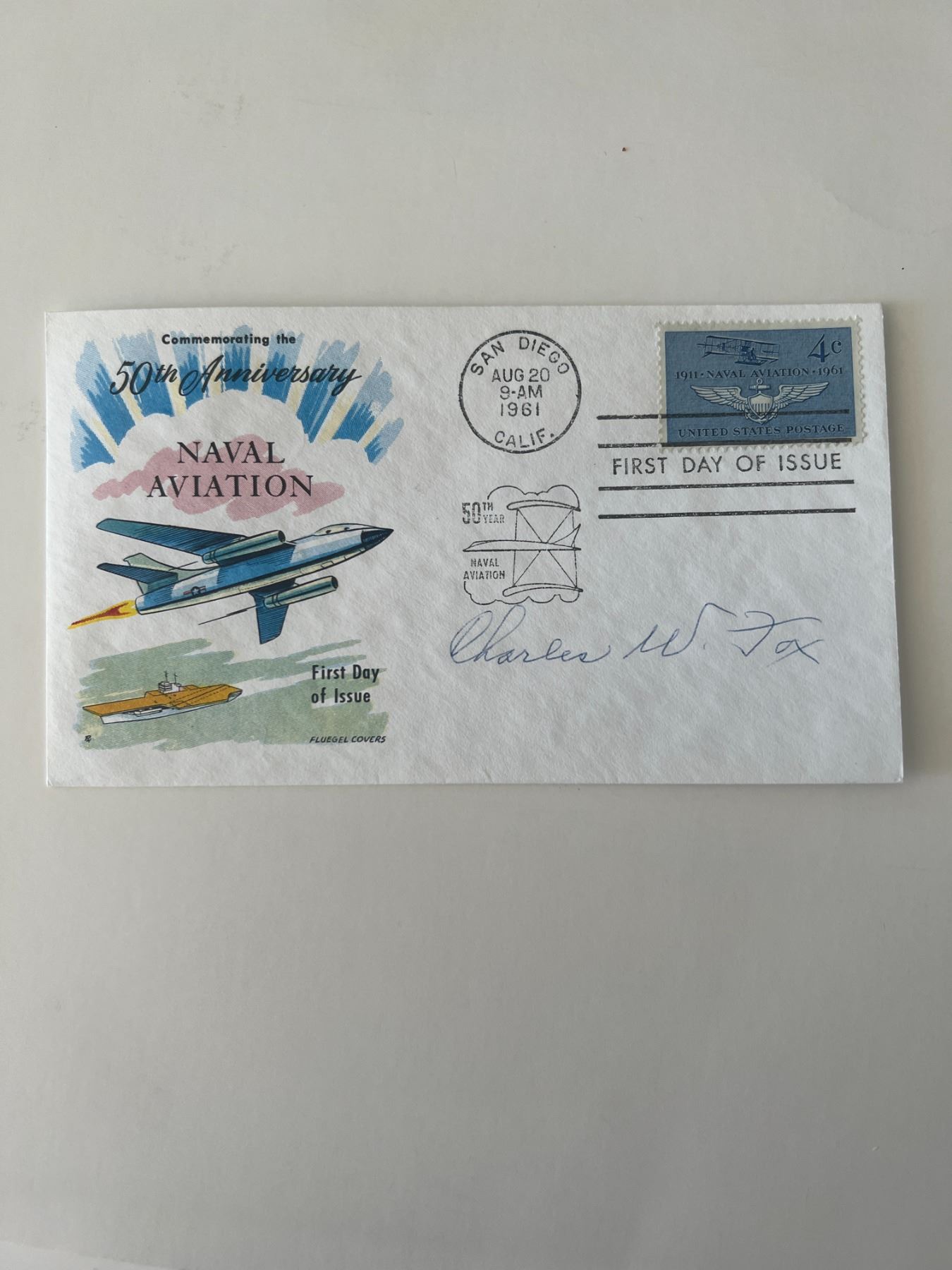 Charles W. Fox signed naval aviation 50th-anniversary commemorative cover. San Diego, CA. Aug. 20, 1961. 6x4 inches