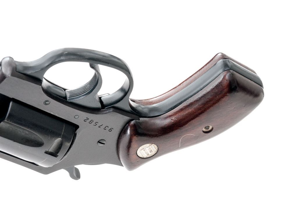Charter Arms Off-Duty Double Action Revolver, #937582, .38 Spec. cal., 5-shot, 2" barrel, blue finish, two-piece smooth hardwood Charter Arms grips, blade front sight with red dot insert, and square-notched rear sight. Condition is very good retaining approx. 97% blue. Metal with scattered slight marks from handling and use. Grips with intermittent shallow indentations, no major blemishes. Action cycles smoothly, cylinder lockup is good. Bore is bright with excellent rifling. Est.: $150-$300. (Modern/PPT)