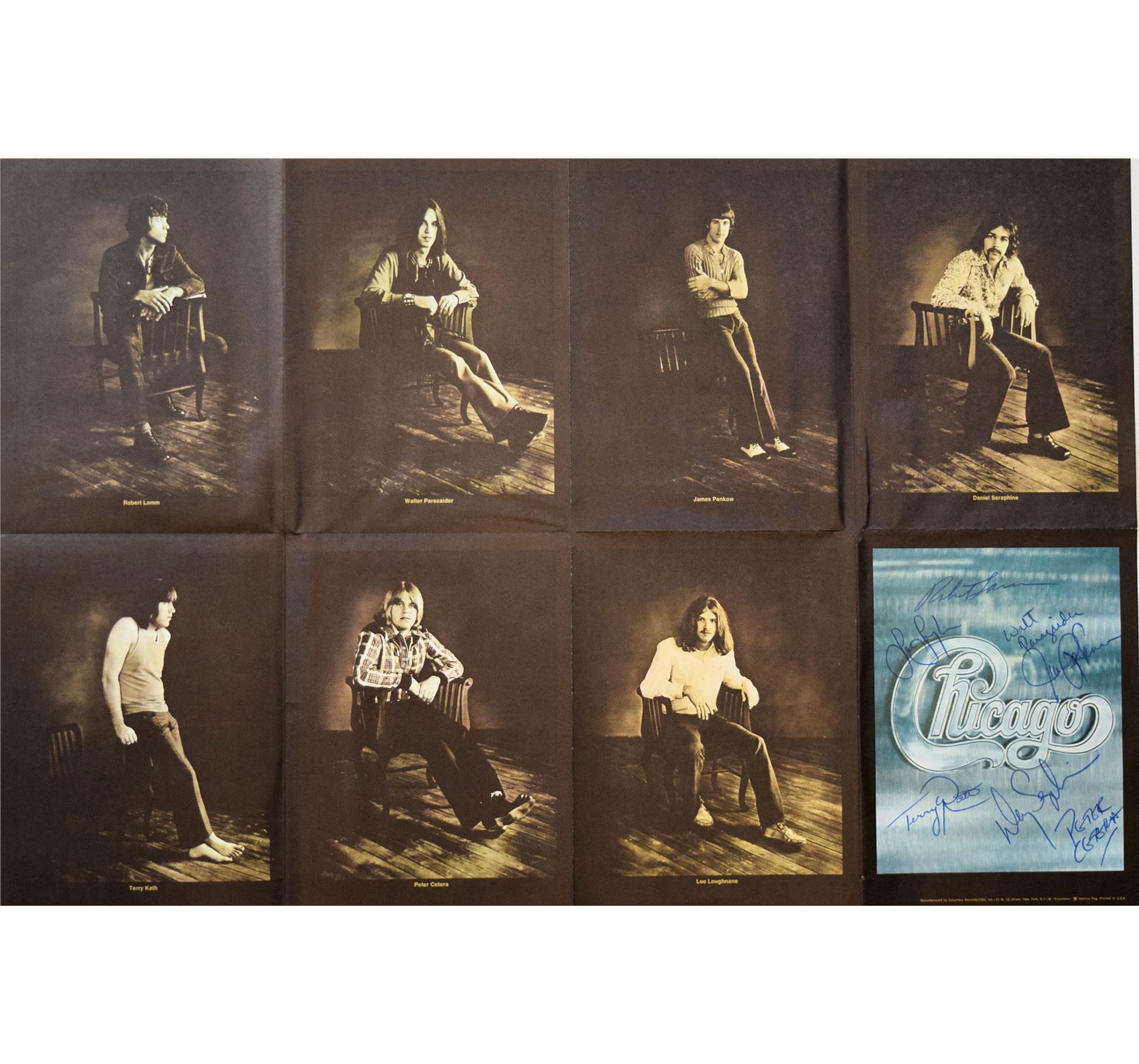 36 in. by 20 in. Insert poster to the album Chicago II,. Signed: Peter Cetera, James Pankow, Lee Loughnane, Walt Parazaider, Danny Seraphine, Robert Lamm and Terry Kath