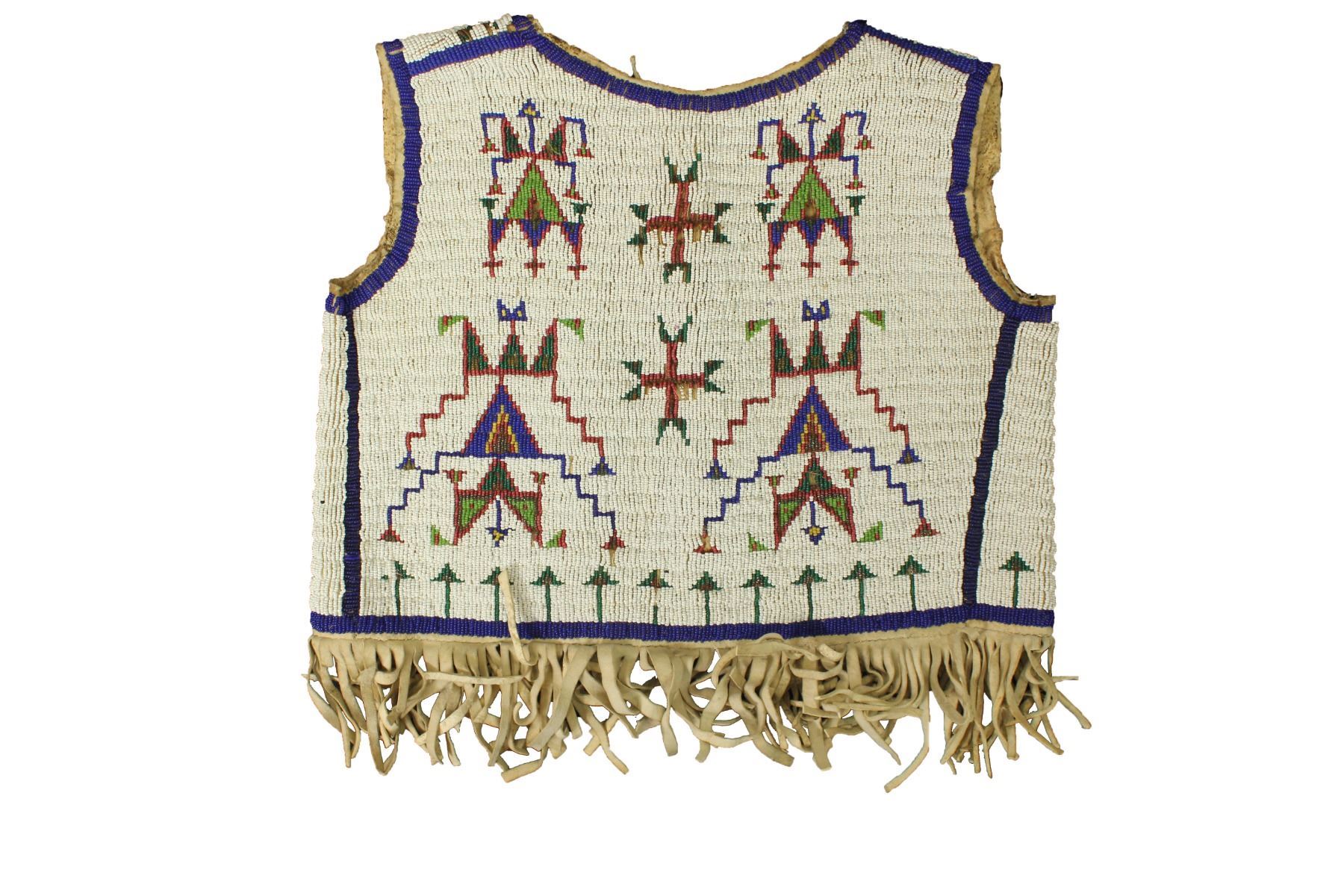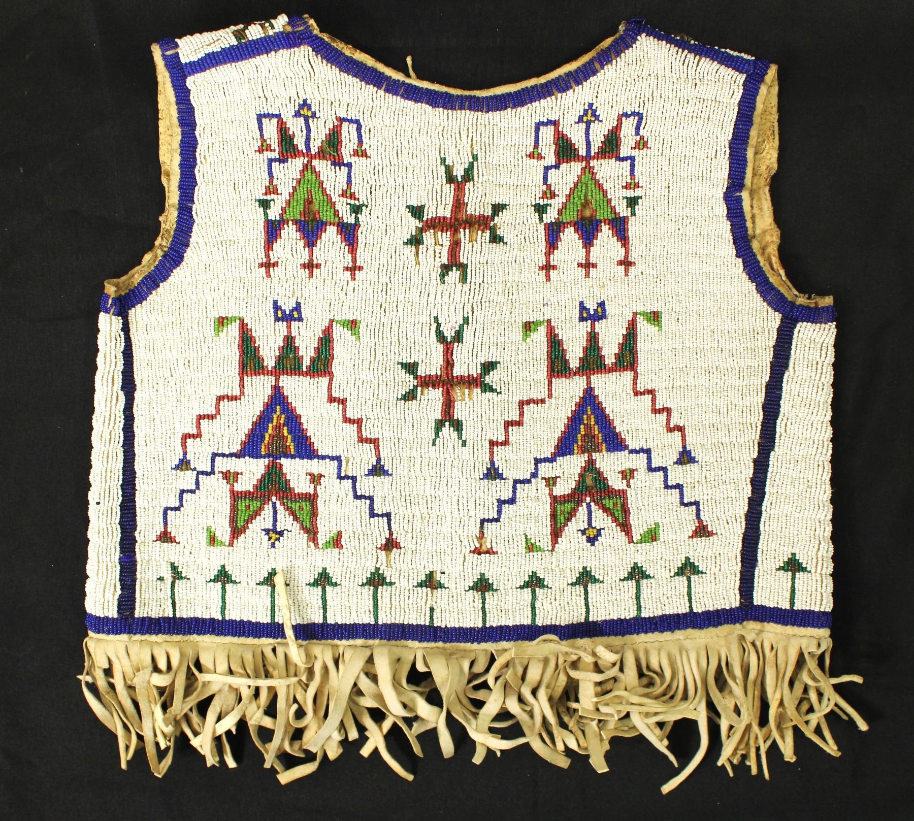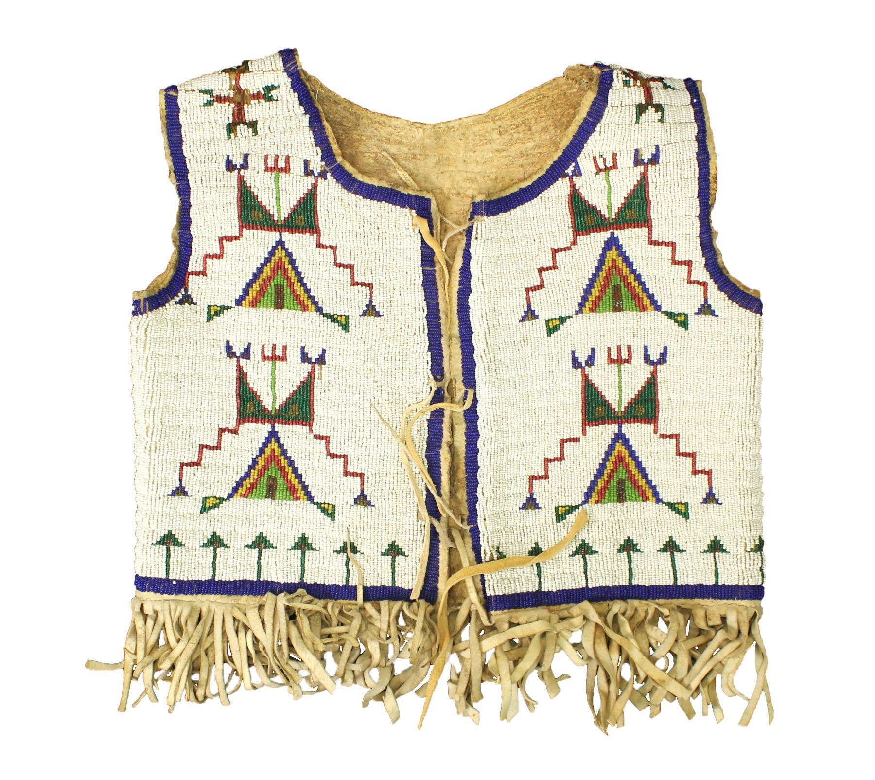 Fabulous fully beaded turn-of-the-century vest on hide, with outstanding geometric design on white background, accented by great fringed bottom.