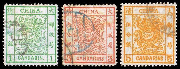China, 1878, Large Dragons on thin paper, 1ca-5ca complete Chan 1-3. Scott 1-3, nicely centered, Fine to Very Fine+. Scott 1,725 HK 13,580.