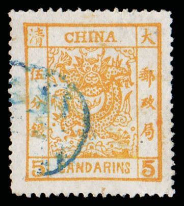 China, 1882, Large Dragon wide margins, 5ca yellow ocher, thin paper Chan 6. Scott 6, a well-centered example with intense color, neatly cancelled; trivial, barely noticeable pinpoint thin speck, otherwise Very Fine+. Scott 1,500 HK 11,810.