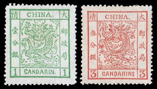 China, 1882, Large Dragons wide margins, 1ca green & 3ca brown red, thin paper Chan 4-5. Scott 4-5, each fresh with bold colors, o.g.; the 3ca with a tiny paper speck by the dragons head, otherwise Very Fine. Scott 1,700 HK 13,390.