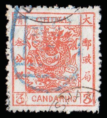 China, 1883, Large Dragon on thick paper, 3ca vermilion, rough perf 12, semicircle to left of CANDARINS Chan 11f. Scott 8 var., an absolutely superb example offering vibrant color and excellent centering, blue seal cancel, along with partial Shanghai French Post Office transit, Extremely Fine. Scott 500 as normal HK 3,940.