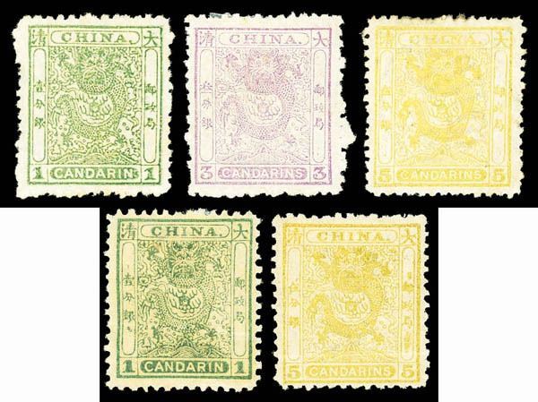 China, 1885-88, Small Dragons, 1ca to 5ca selection Chan 16-18, 19, 21. Scott 10-12 var, 13, 15, nice mint group of five items: a fresh, complete 1ca to 5ca rough perforation set, plus 1ca and 5ca smooth perf 12 types, good colors, all with o.g., Fine to Very Fine+. Scott 1,485 HK 11,690.