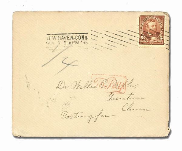 China, 1896 Nov. 9, To Pay cover, sent Connecticut to Paotingfu, franked by 5 Grant tied by New Haven Nov 9 cancel, with red boxed To Pay. handstamp across addressees name; reverse bears Tacoma, Wash. NOV 15 transit, U.S. Postal Agency Shanghai DEC 27 receiver, plus two Shanghai Customs double-ring daters, one in black Dec. 29, 1896, one in blue JAN 19, 1897; addressed to Tientsin/China/Paotingfu; with original correspondence, Very Fine, a rare destination outside Peking and Tientsin.