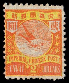 China, 1897, Imperial Chinese Post, 2 orange & yellow Chan 102. Scott 96, bold, rich color and wonderfully fresh, o.g.; centered to left with a few customary ragged perforations, Fine. Scott 3,000 HK 23,620.