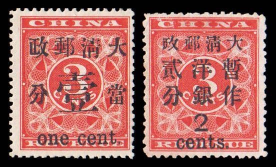 China, 1897, Large 1 on 3 and Large 2 on 3 Red Revenues Chan 87, 87a, 88. Scott 78, 78b, 80, five items in total: unused 1 on 3, two used 1 on 3 large central box variety, plus two unused Large 2 on 3 surcharges, each fresh, unused without gum, Fine to Very Fine, attractive group; examine. Scott 2,825 HK 22,240.