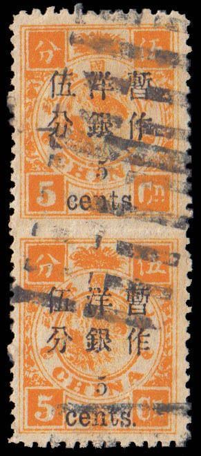 China, 1897, Small Figures surcharge on Empress Dowager, 5 on 5ca dull orange, imperf between Chan 41c. Scott 32a, vertical pair, a choice, beautifully centered used pair with bold, vivid colors and Pakua cancels in black; neat and light unobtrusive fold directly between the stamps, Very Fine and choice, a stunning example of this rarity, of which only nine used examples are known, with 2018 Experts & Consultants Ltd. certificate. Scott 20,000 HK 157,480.