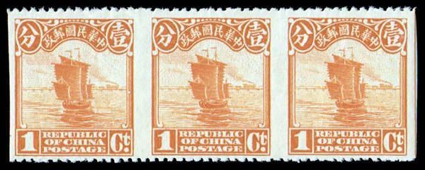 China, 1900, Chinese Imperial Post, unwatermarked, 1 gray yellow, imperforate vertically Chan 117s var. Scott 111a var, horizontal strip of 3, wonderfully fresh and bright, Very Fine, a striking and scarce variety. Scott 350+ HK 2,760.