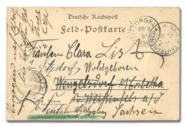 China, 1901 Aug. 28, stampless Fieldpost card, sent Tongku to Wenzelsdorf, sent postage-free, bearing solid strike of Tongku/28 8/01/Deutsche Post c.d.s.; addressed to Wenzelsdorf, crossed out and forwarded; front also bears comb-style Corbetha/9.10.01 and Teutschenthal/1./10 10/01 receivers, the latter partially overstruck on the Tongku origin; generally clean, Fine to Very Fine+, an unusual destination.