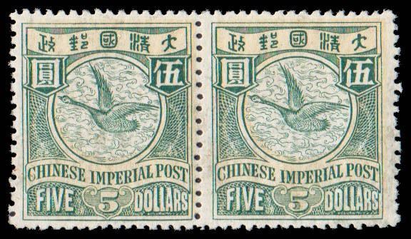 China, 1902, Chinese Imperial Post, unwatermarked, 5 green & salmon Chan 128. Scott 122, horizontal pair, an attractive unused pair, expertly regummed, Fine to Very Fine, a scarce multiple. Scott 1,750 HK 13,780.