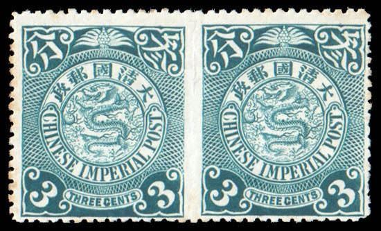 China, 1909, Chinese Imperial Post, unwatermarked, 3 slate green, imperf between Chan 130d. Scott 125a, horizontal pair, fresh mint, full clean o.g., Fine to Very Fine+, an attractive variety. Scott 350 HK 2,760.