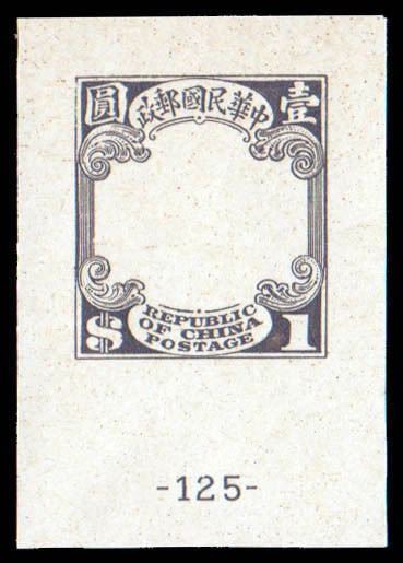 China, 1915, Hall of Classics, First Peking printing, 1 black, trial color proof of frame Chan 244. Scott 236, a splendid and rare trial color die proof in black, numbered -125- at bottom; printed on thick buff card stock, Very Fine and choice, excellent quality.
