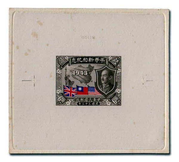 China, 1945, Treaties of Equality, 6 gray trial color proof Chan 848. Scott 596, splendid engraved trial color die proof, the engraving in gray, printed on surfaced paper, numbered 85112 and affixed to card; few trivial age spots, otherwise Very Fine, scarce.