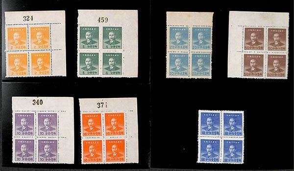 China, 1949, Silver Yuan, Dr. Sun Yat-sen, 1-500 complete Chan S22-S30. Scott 973-981, lovely set in blocks of four, all but 100 and 500 margin blocks, most corner with sheet number, generally fresh, without gum as issued, Very Fine, a tough set, especially as multiples. Scott 4,168 HK 32,820.