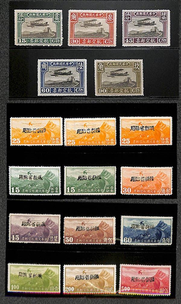 China, Airmail, small mint selection, a fresh, clean group comprising Second Issue Airmail issue complete Scott #C6-C10, Very Fine, never hinged; plus a set of Sinkiang Province woodchop handstamps complete, Very Fine, examine.