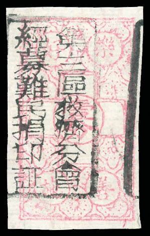 China, Famine Relief, 1941, 1 pink on laid paper, brightly colored and solidly margined on very thin horizontally laid local paper, with black No. 3 District, Famine Relief Branch, Relief Stamp overprint, without gum as issued; small bend at bottom of absolutely no consequence, Very Fine, a pretty, eye-catching item.