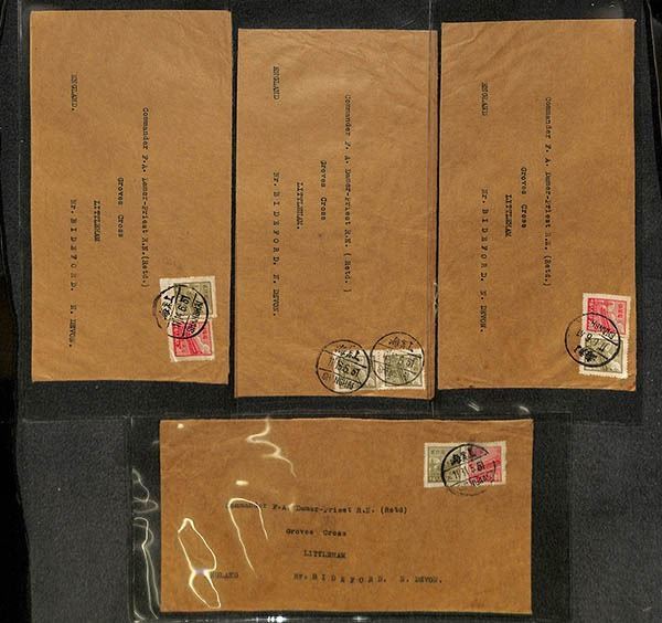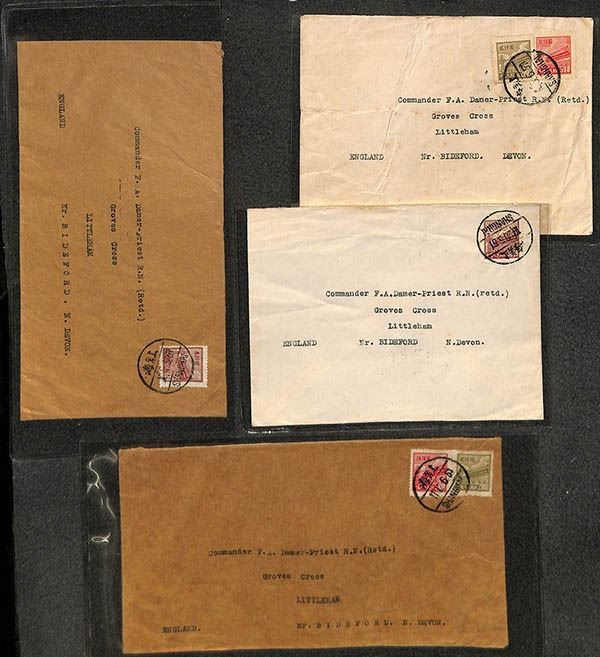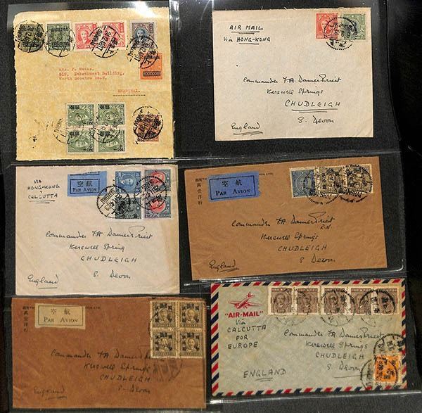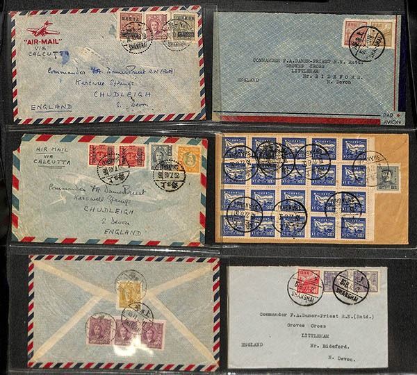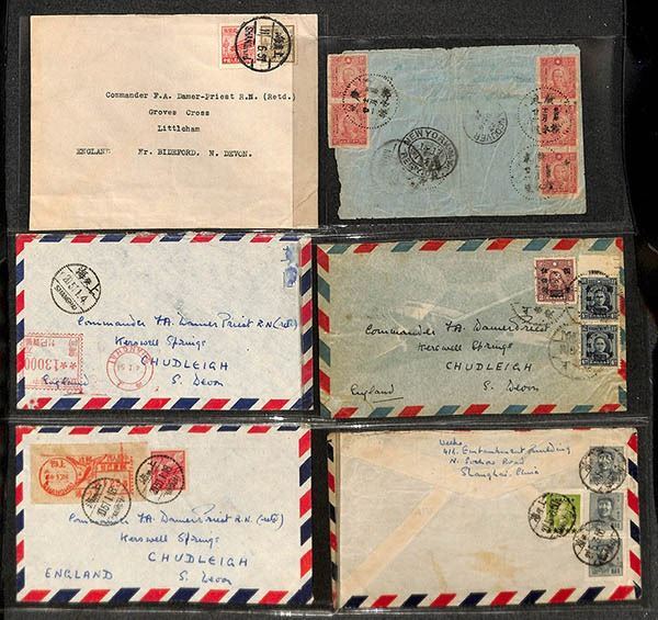 China, Interesting pair of postal history correspondence groups, clean group of approximately 37 covers from Shanghai to England from two correspondences, beginning in the CNC era and going to the early PRC years 1951; composition shows approximately 12 pre-PRC usages and 25 early PRC covers, including a machine meter cover and a choice combination Gate issue stamp/meter label example, Fine to Very Fine or better, a nice old-time lot; see them all online.