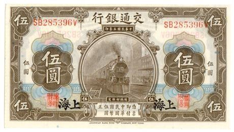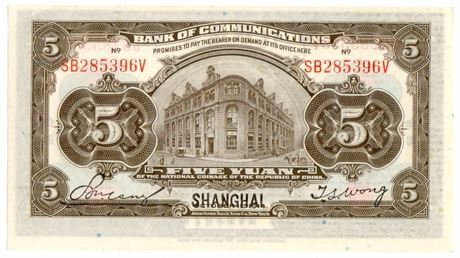 China P#117o 1914 Bank of Communication Five Yuan Looks UNC, one small corner bend