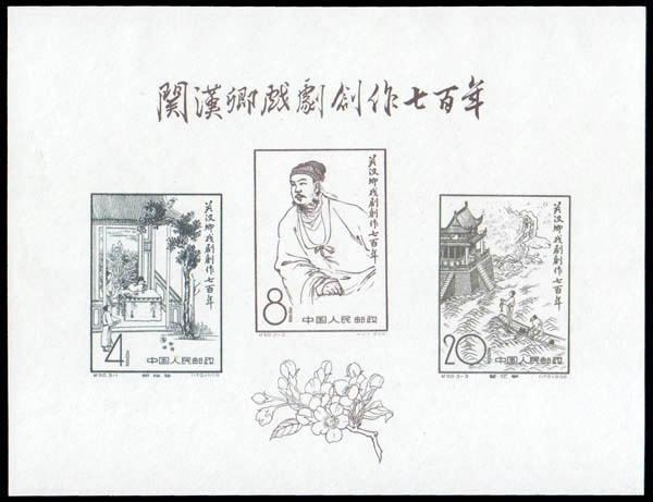 China Peoples Republic, 1958, Kuan Han-ching souvenir sheet C50M Scott 357a, Post Office fresh, without gum as issued, Very Fine. Scott 475 HK 3,740.