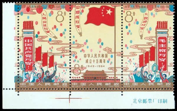 China Peoples Republic, 1964, 15th Anniversary of the Peoples Republic C106 complete Scott 798b, se-tenant strip of three with imprint, unfolded, o.g., never hinged, Very Fine. Scott 300+ HK 2,360.