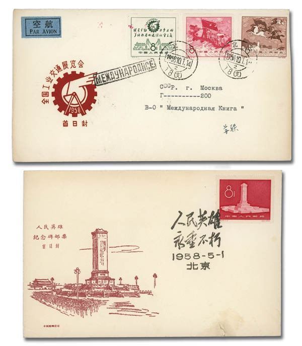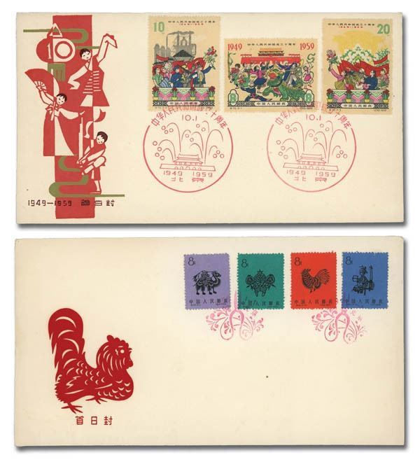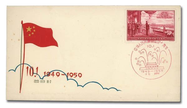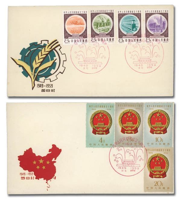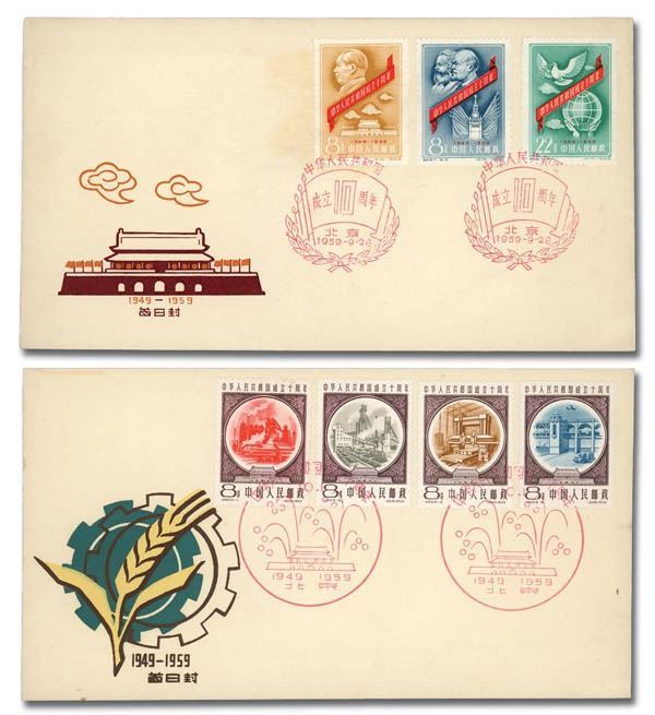 China Peoples Republic, Interesting group of First Day Covers, 1958-59, 11 in all, comprising both C- and S-series issues; all cacheted several issue-specific, though most show various designs relating to the tenth anniversary of the PRCs founding, three addressed to Moscow; the lot comprises Scott #344, 358-359 addressed to the Moscow Planetarium, 362-363, 374-376, 398-401, 438-440, 441-444, 445-452 two covers with four stamps each, 453-455 and 456; #344 cover with small tear at bottom; envelope paper lightly toned, still Very Fine overall, a pretty grouping of these popular items.
