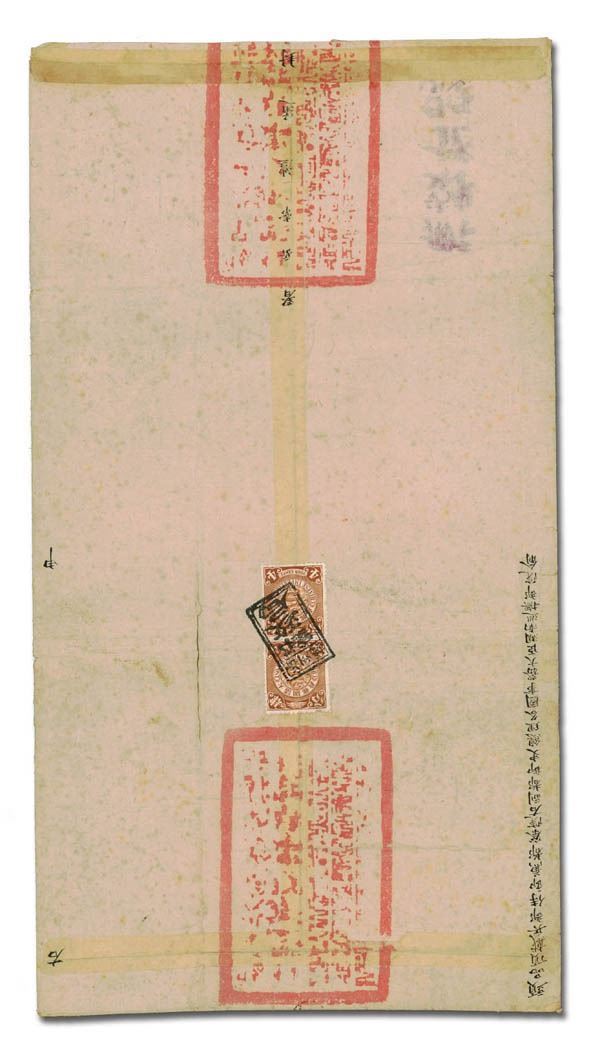 China, ca. 1898-1902, large-size Official Mail cover to Hunan, attractive cover bearing a pair of 4 Coiling Dragons tied by bold, perfect strike of Yueh Chow Fu boxed cancel; written by the Administrative Officer at Yueh Chang to the Governor of the Province of Hunan; reverse shows Pay No More marking, etc.; small cover split of no consequence, Fine to Very Fine, a rare item.