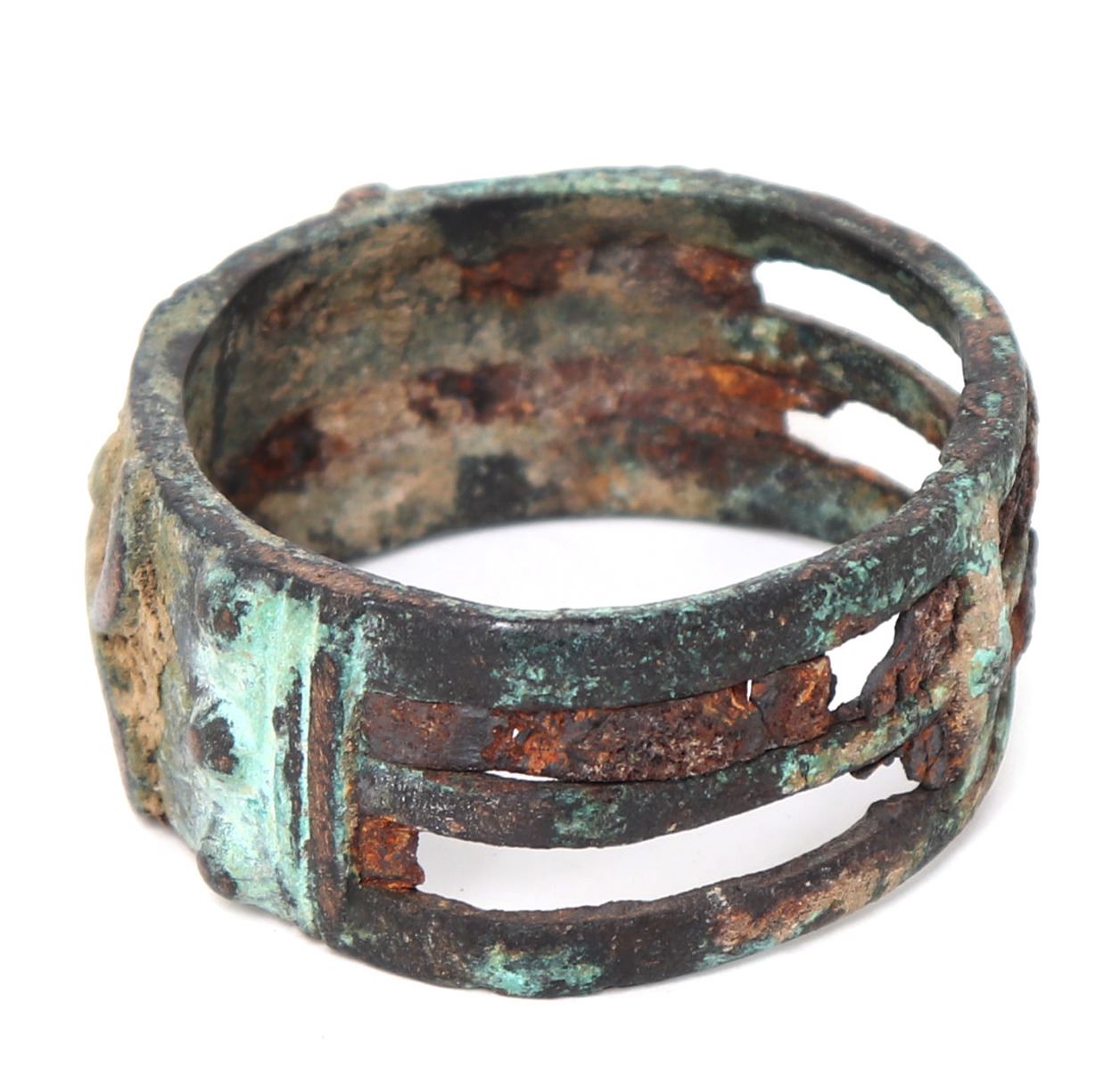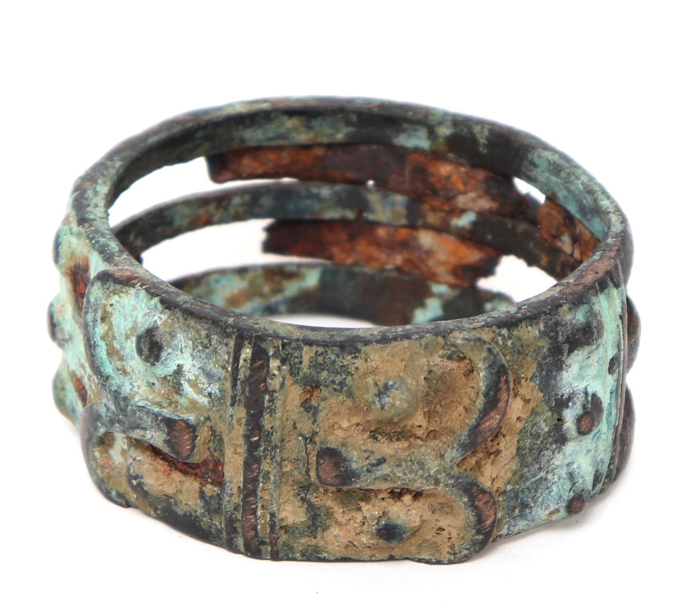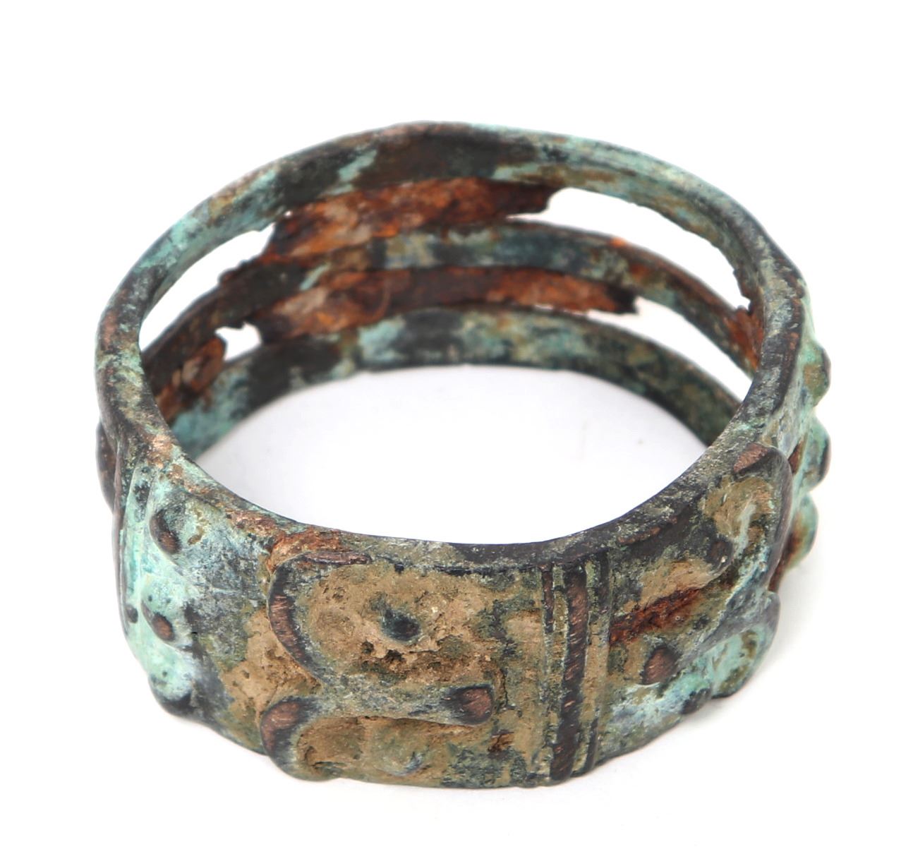 Chinese archaistic bronze bracelet inlaid with sections of iron. Cast with decorative designs of the face possibly Taotie, a legendary monster from Chinese mythology. Size 2 3/4" L x 1 1/8" W. Condition: Signs of age from use and corrosion to iron elements.. Provenance: Ex-Pasadena, California collection