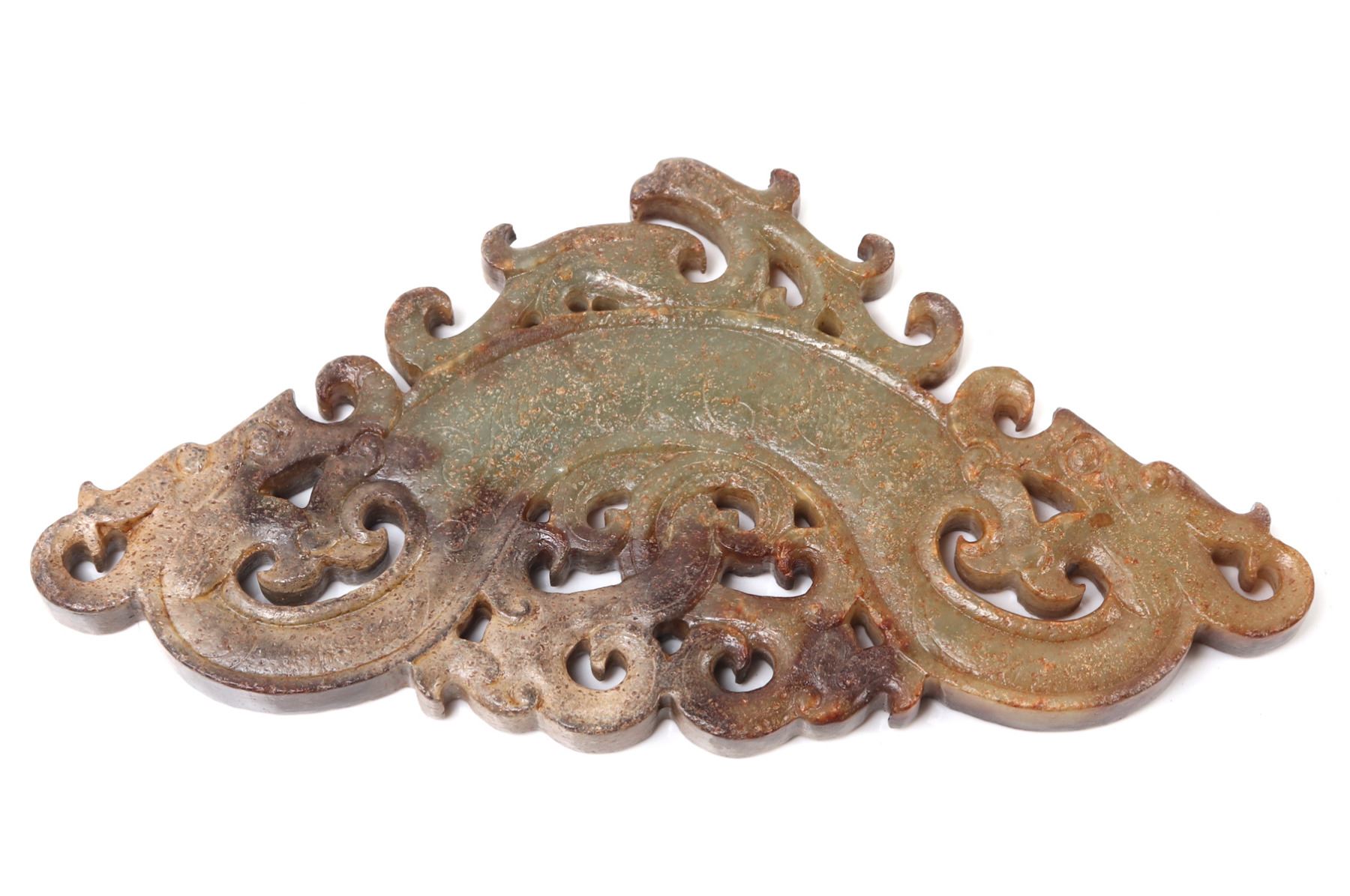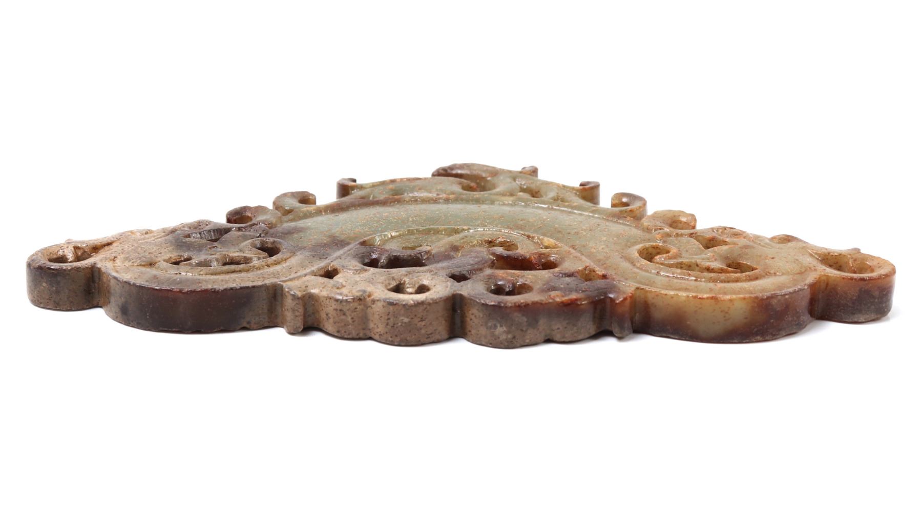 Chinese archaistic carved hardstone pendant with to opposing dragons, fine openwork and incised details. Size 3" L x 4" W weight 81g