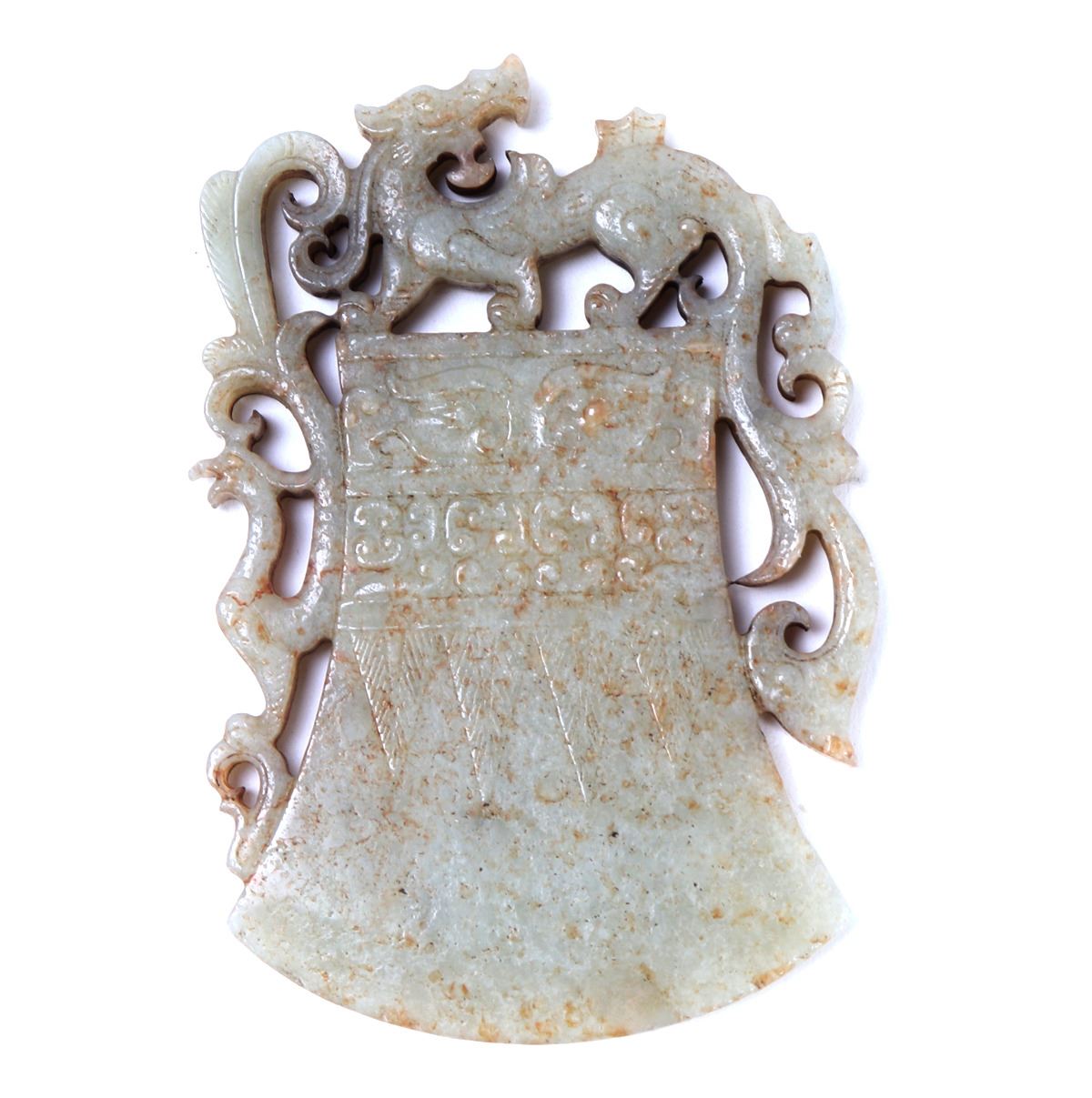 Chinese archaistic jade style stone, mottled green with specks of iron red coloring throughout. Carved from a single piece of hardstone with incredible details throughout including a dragon finial and incised details throughout the axe head body. Could be suspended and worn as a pendant. Size 3 3/4" L, Weight 80 g. Condition: Good overall condition.
