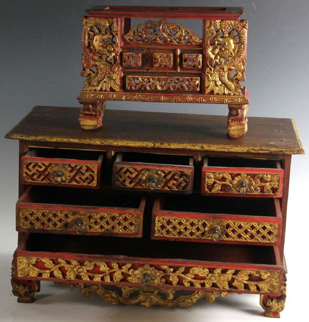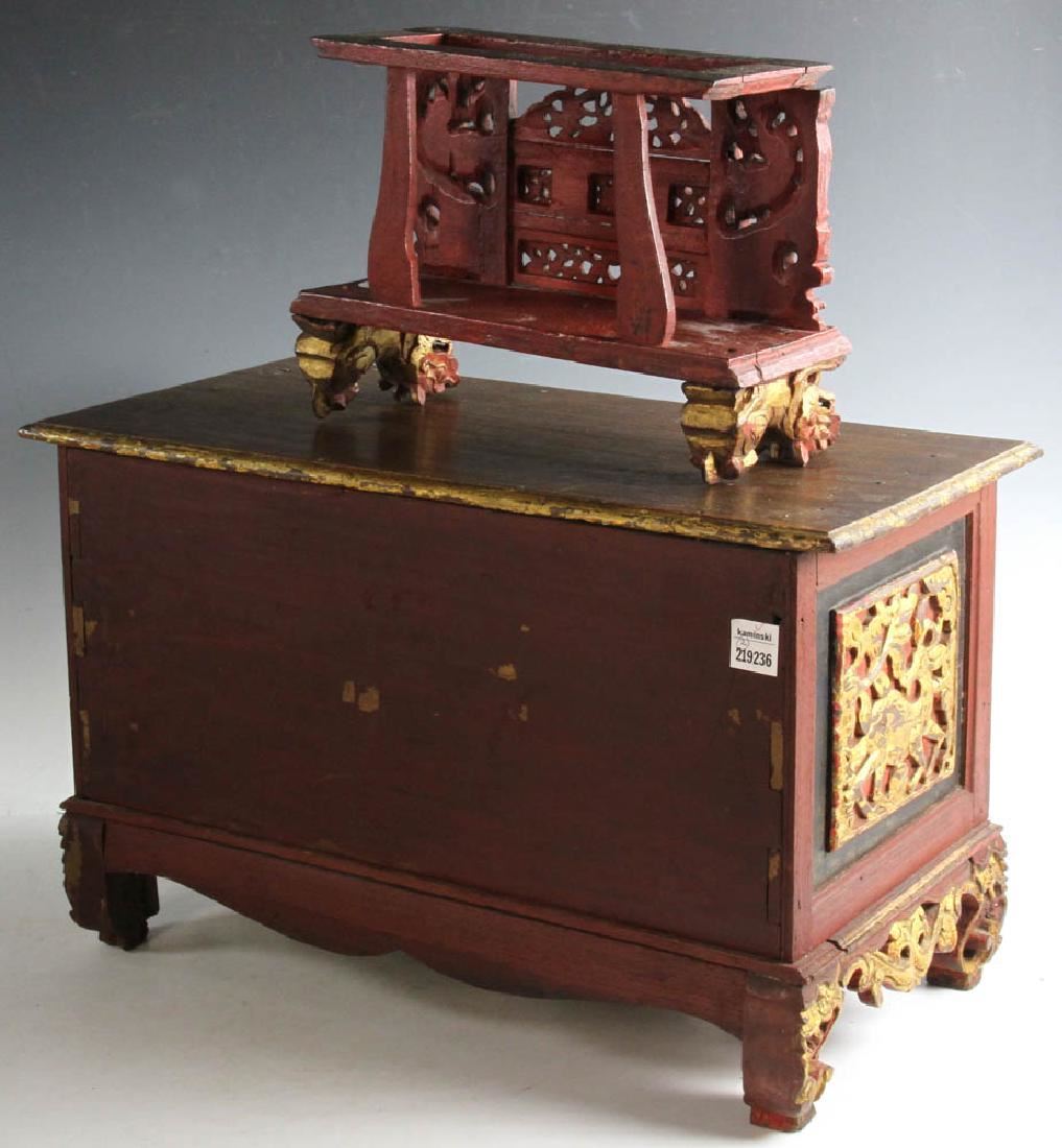 Chinese ornately-carved wooden table-top altar on chest, with dragon carved panels and foo lion figures, red ground with gilt trim. Chest is late 19th century; altar is early 20th century. Chest 12 1/4" H x 20 1/8" W x 9 3/4" D; altar 8" H x 11 1/4" W x 4 1/8" D. Provenance: Broomfield, Colorado estate.