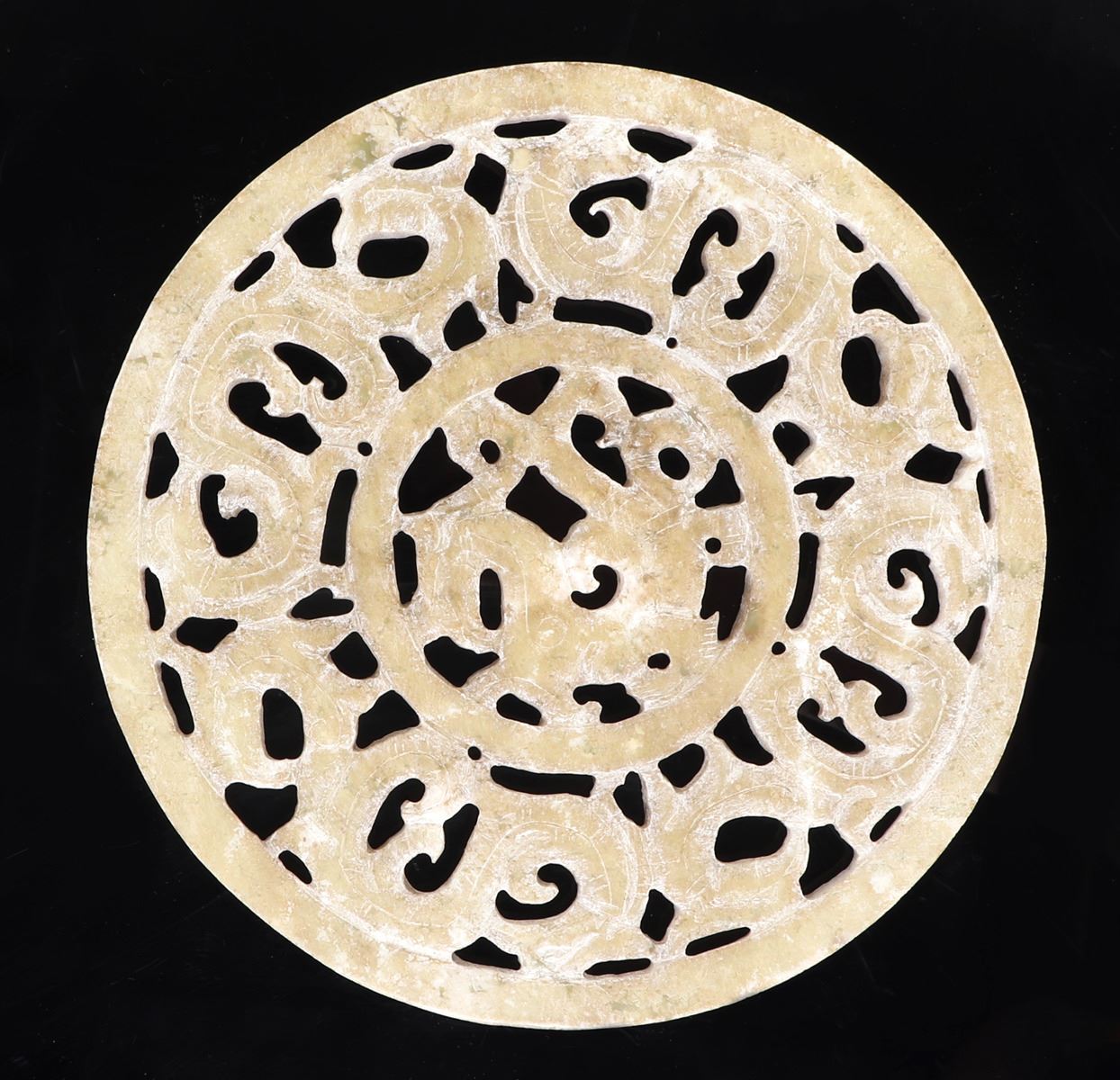 Chinese intricate openwork bi-disc carving, depicting zoomorphic beasts to the center and outer rim. Incised details to the animal bodies acting like scales on the skin. Lovely light green and white mottled stone. Size 7 7/8" W, weight 439 g. Condition: Good overall condition with some surface wear as shown.
