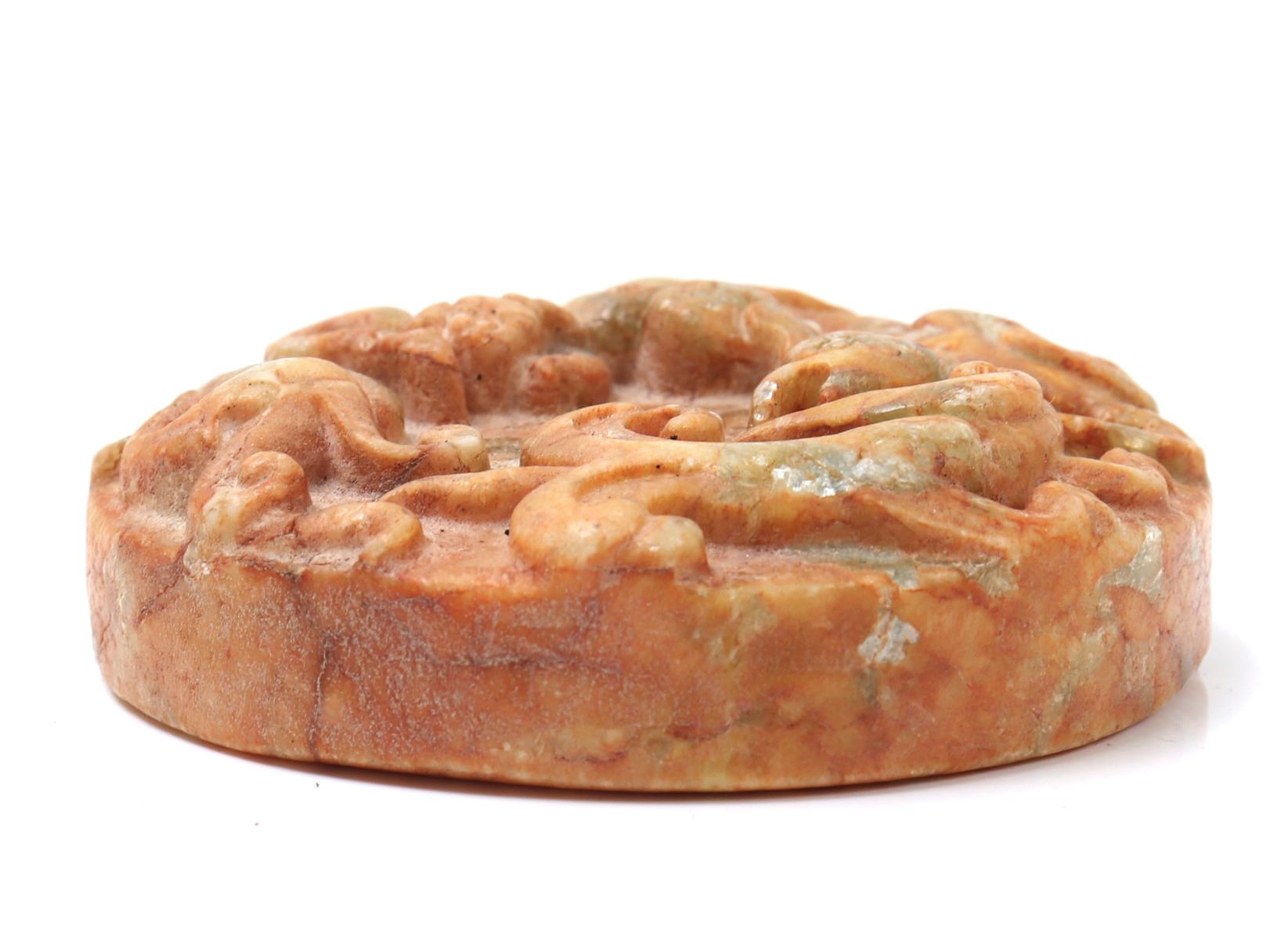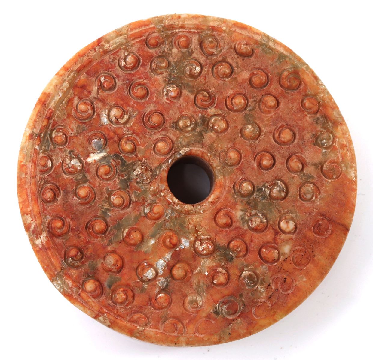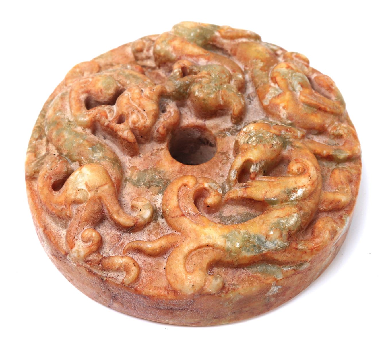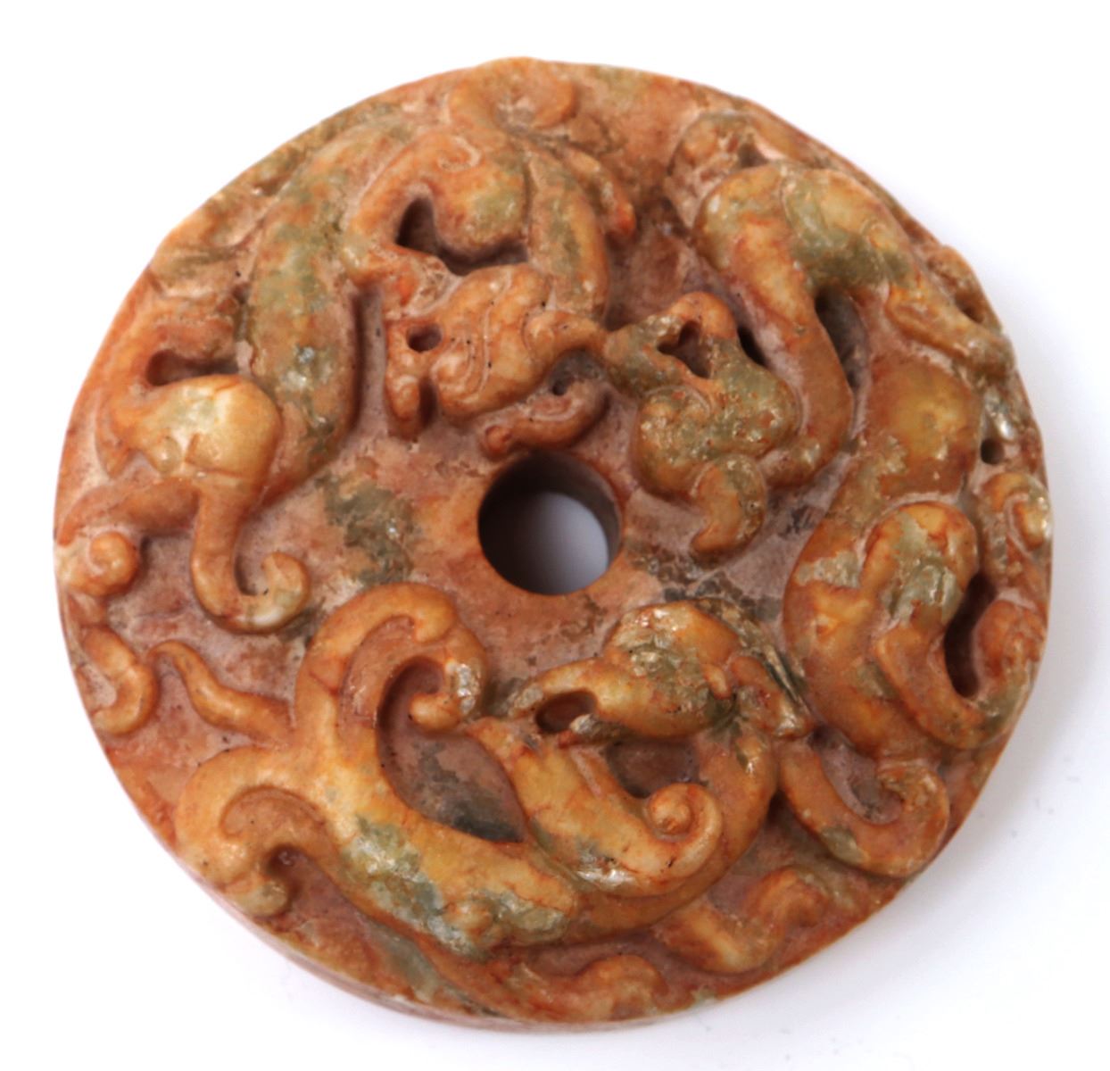 Chinese marbled jade style stone Bi disc with beasts in high relief throughout the top of the disc and high relief dots to the reverse. Size 3" L x 3" W weight 168g. Condition: As-is with minor soiling.