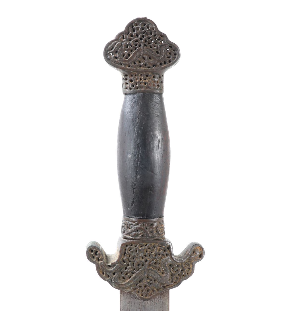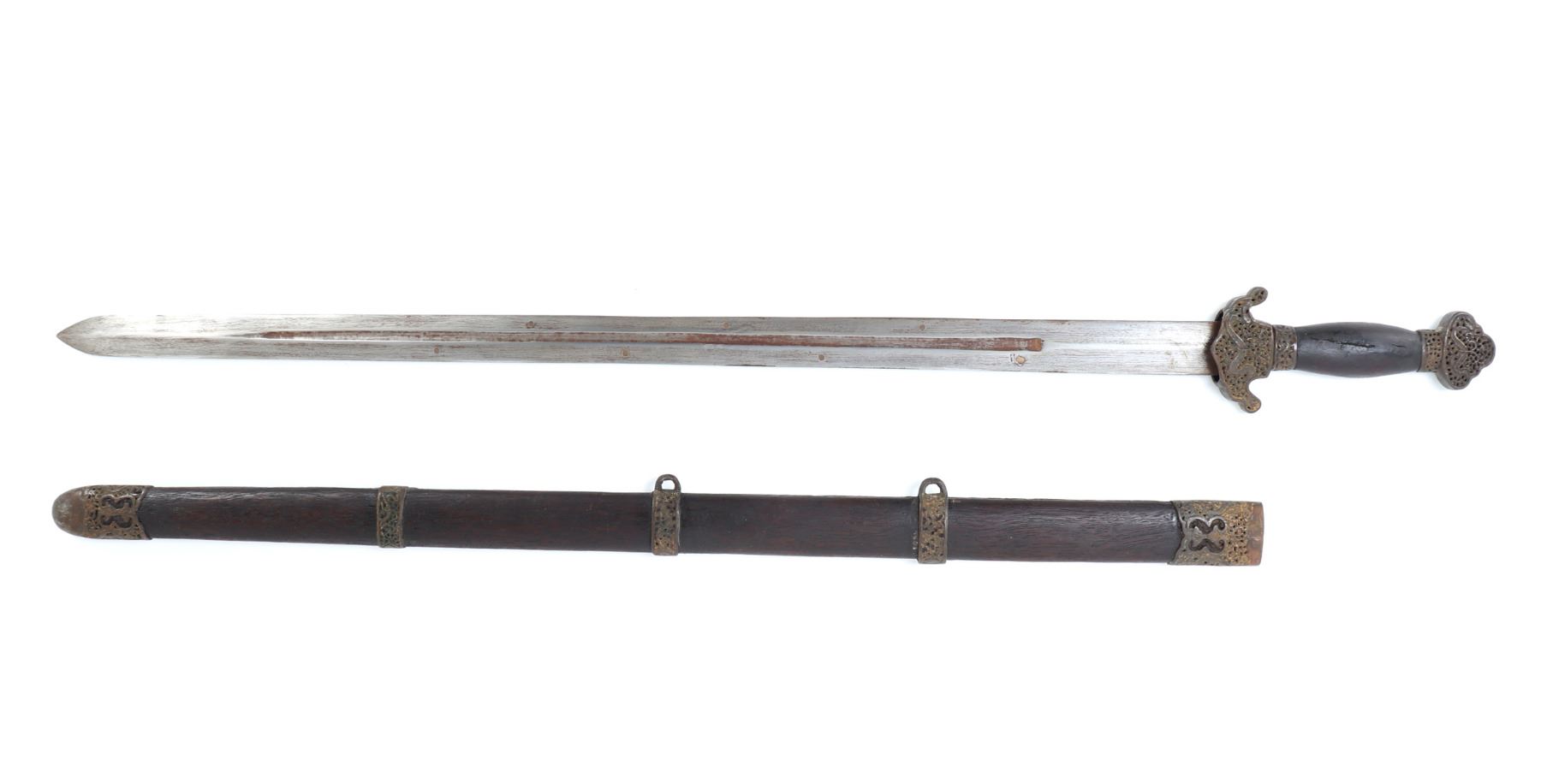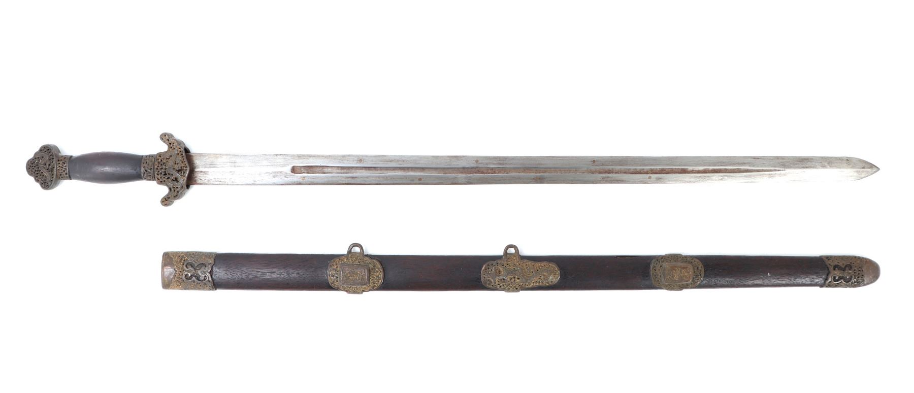 Old Chinese Jian sword and scabbard. Straight double edged blade with brass inlaid circles to either side of the fuller. Mounts in pierced brass openwork with dragons and inscribed motifs throughout. Size 36 1/8" L, Blade 28 7/8" L. Condition: good condition overall. Provenance: Ex-Southern California Estate
