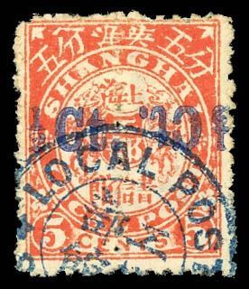 Chinese Local Posts: Shanghai, 1893, Double Dragons, on half of 5 carmine pink, double surcharges, one inverted Chan LS142 var. Scott 146 var, pair, a fresh and bright example of this striking variety; pulled perforation at top left, otherwise Fine to Very Fine+, highly uncommon, especially used.