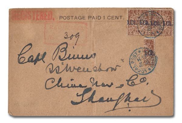 Chinese Local Posts: Shanghai, 1893 (May), registered locally used "Postage Paid 1 cent" envelope en