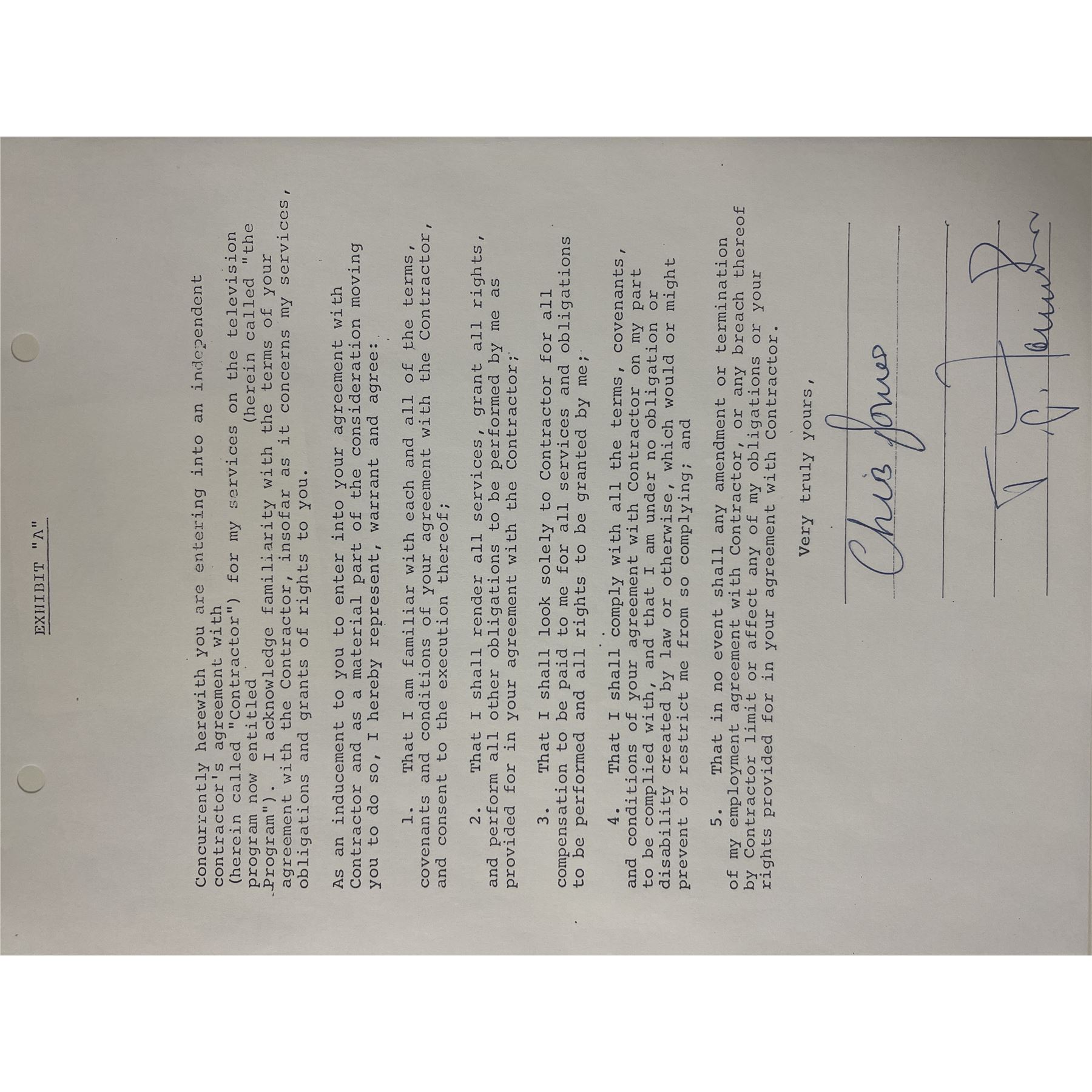 Chris Jones signed contract. 8x11 inches