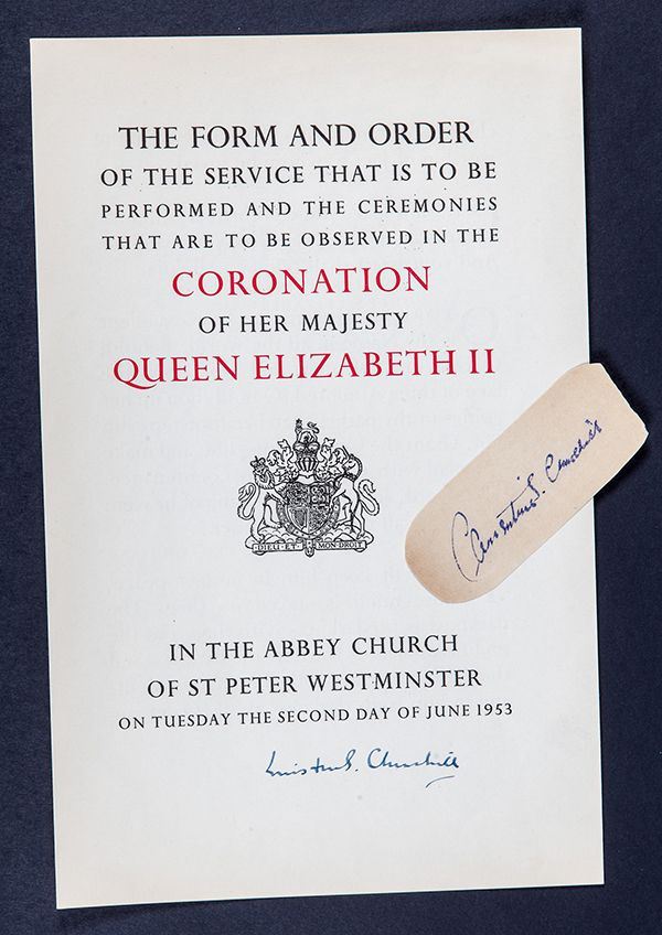 Churchill, Winston S. Two-color printing of "The Form and Order of the ServiceTo Be Observed In The Coronation of Her Majesty Elizabeth II In the Abbey Church of St. Peter Westminster On Tuesday The Second Day of June 1953," signed in full by Churchill at the bottom, 7 x 11 in. Accompanied by a clipped signature of Churchill's wife, "Clementine S. Churchill" and a nice book photo of Churchill, suitable for framing. Attractive and unusual.