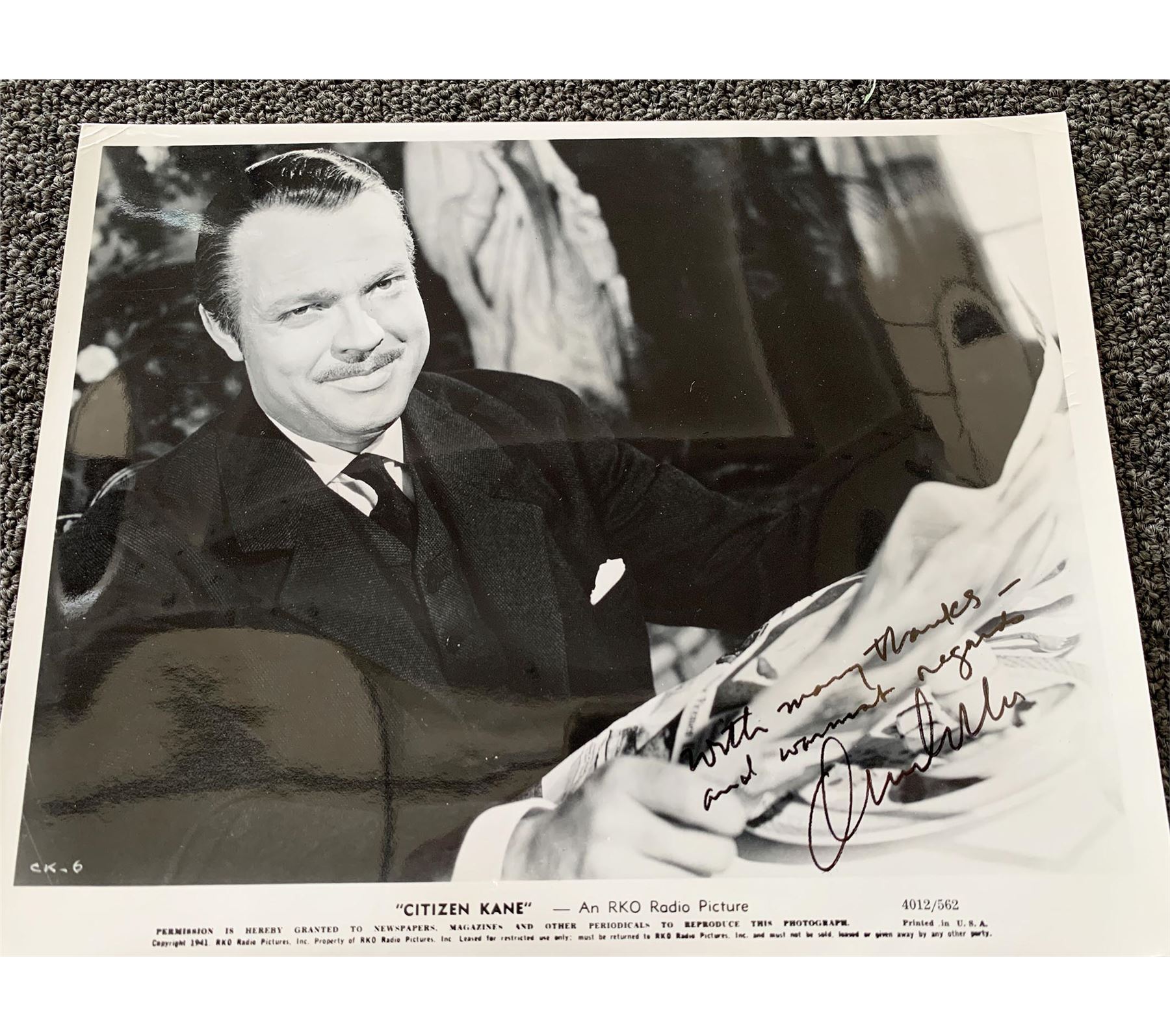 Citizen Kane 1941 signed movie photo autographed by Orson Welles. 8x10 inches