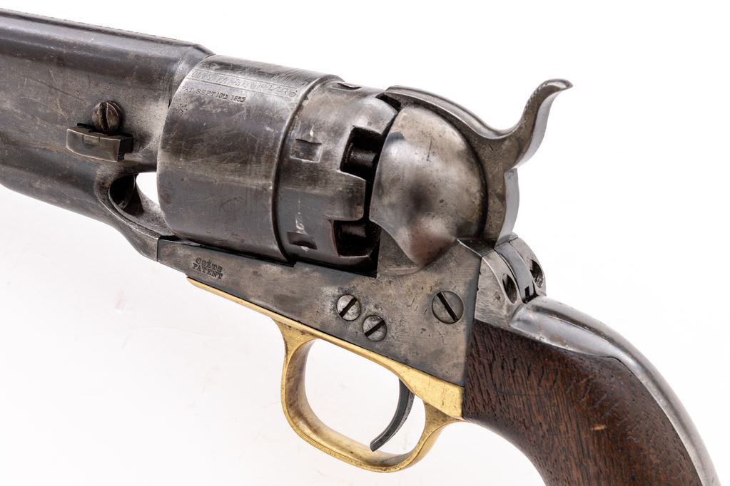 Civil War Colt Model 1860 Army Percussion Revolver, Cased with Accoutrements, #64486, .44 cal., 8" "streamlined" barrel marked with maker's name and "U.S. America" address on top, has patented creeping loading lever; rebated 6-shot round cylinder is roll-engraved with the naval battle scene, marked "Colts Patent No. 4486" within a box and "Pat. Sept. 10th 1853" below; open-top frame is marked "Colts/Patent" at lower front, has flush hammer screw and notches cut at recoil shield for attachable shoulder stock (not present) and another at butt of iron backstrap, brass trigger guard, 1-pc. oil-finished walnut grip. Mfg'd 1862. Condition is very good retaining approx. 35% thinning original barrel blue especially at right side, 40% darkening cylinder blue, else smooth gunmetal gray (perhaps with added finish), nicely muted case colors, bright brass. Grips are sound and smooth with a few marks, wear to both sides at bottom, red-painted "arrowheads" at either side of butt, lack inspector cartouches. Lever and wedge are modern replacements. Action is crisp, bore is bright with occasional oxidation and sharp rifling. Cased in a modern walnut box lined in reddish felt with instructions label in lid and partitioned for a bow-leg Colt bullet mold marked "44H", reproduction "eagle-and-stars" pocket flask, repro pack of skin cartridges, repro nipple wrench, 100-ct. Alcon cap tin, a number of cast lead balls and working case key, all in very good condition. Est.: $1,200-$1,800. (Antique)