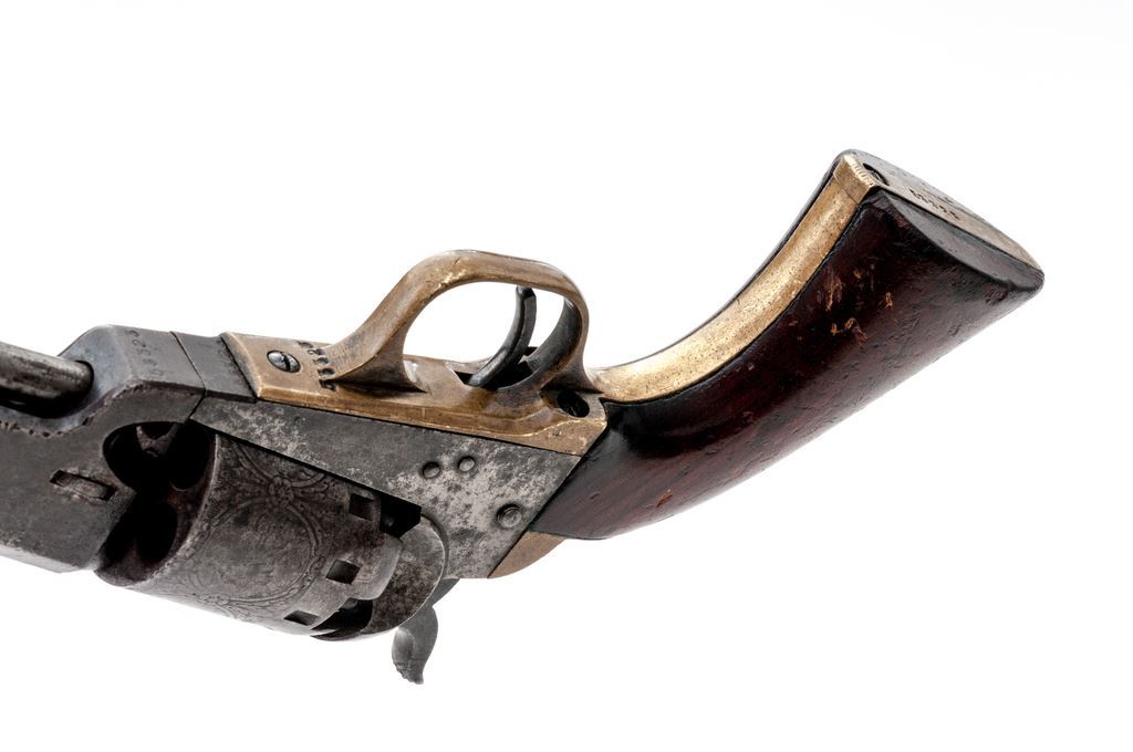 Civil War Manhattan Series IV Navy-Caliber Revolver, #53323, .36 Cal., 6.5" octagonal barrel marked with maker's name, address and "Patented March 8, 1864" in two lines on top flat, has tapered loading lever below; 5-shot round cylinder is roll-engraved with five panels of martial scenes and marked "Patented Dec. 27, 1859" at rear; open-top frame has separate gripstraps, with 1-pc. varnished walnut grips. Mfg'd early 1860s. Condition is very good retaining traces of blue and silver in protected areas and silvered case colors. Grips with wear at sides of butt, scattered dings, much original varnish. Recoil shield spring-plate is missing. Visible numbers (and wedge) match; quite desirable with this longest barrel length. Action is strong and crisp, bore has scattered light erosion, very good rifling. Est.: $500-$750. (Antique)