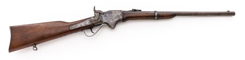 Civil War Spencer 7-Shot Repeating Saddle-Ring Carbine, #16351, .52 RF cal., 22" round barrel has dovetailed block-blade front and sliding-leaf rear sights; receiver marked "Spencer Repeating/Rifle Co., Boston, Mass./Pat'd. March 6, 1860", has serpentine operating lever that drops down breechblock for auto loading/extraction, long side tangs for sidehammer at right and saddle ring/bar at left, 7-shot magazine tube located in buttstock; oil-finished walnut forend retained by a single band, matching buttstock has crescent buttplate with sliding door opening to internal mag. tube, sling loop at belly. Mfg'd ca. 1863-65. Condition is near fine retaining traces of barrel blue, the balance smooth brown patina; traces of case colors to hammer and receiver, the balance having silvered-out to bright metal. Stocks are sound and smooth, forend showing scattered use marks, with two not-quite-legible inspectors' marks at left. Action is crisp, 6-groove bore shows light frosting, occasional oxidation and sharp rifling. Est.: $2,000-$3,000. (Antique)