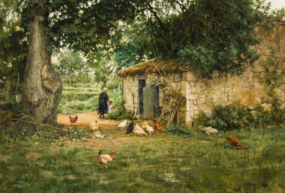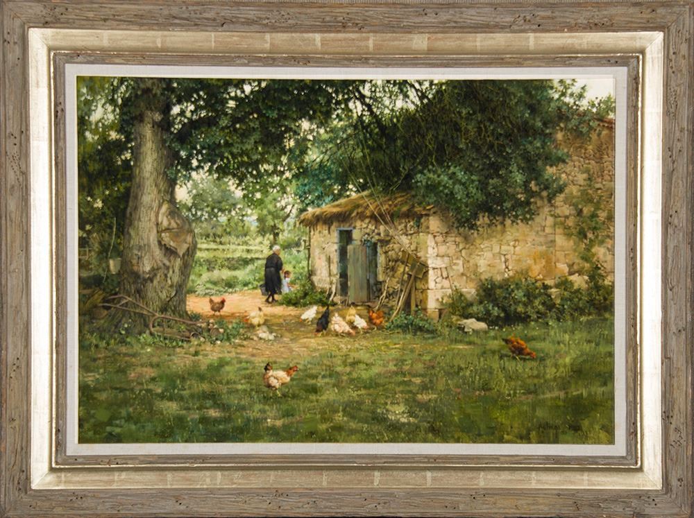 Artist: Clark Hulings; Title: Feeding the Chickens; Medium: Oil on canvas; Dimensions: 22 x 32 inches; Signed: Signed and dated 1982 lower right; Framed/Base: 30 x 40 inches