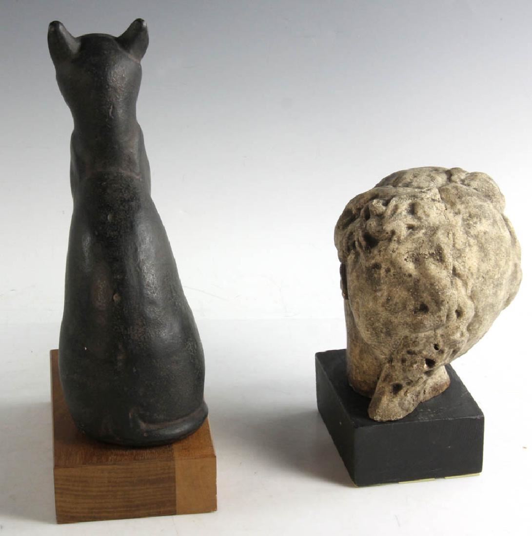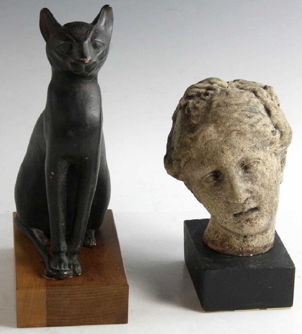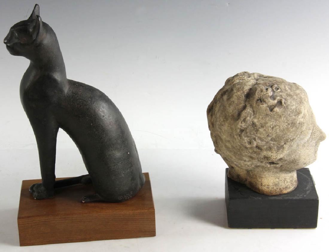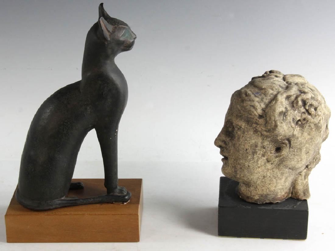 Classical Roman head sculpture, 8 1/4" H (including base) together with an Egyptian cat sculpture, 12 1/8" H (including base). Provenance: Wenham, Massachusetts estate.