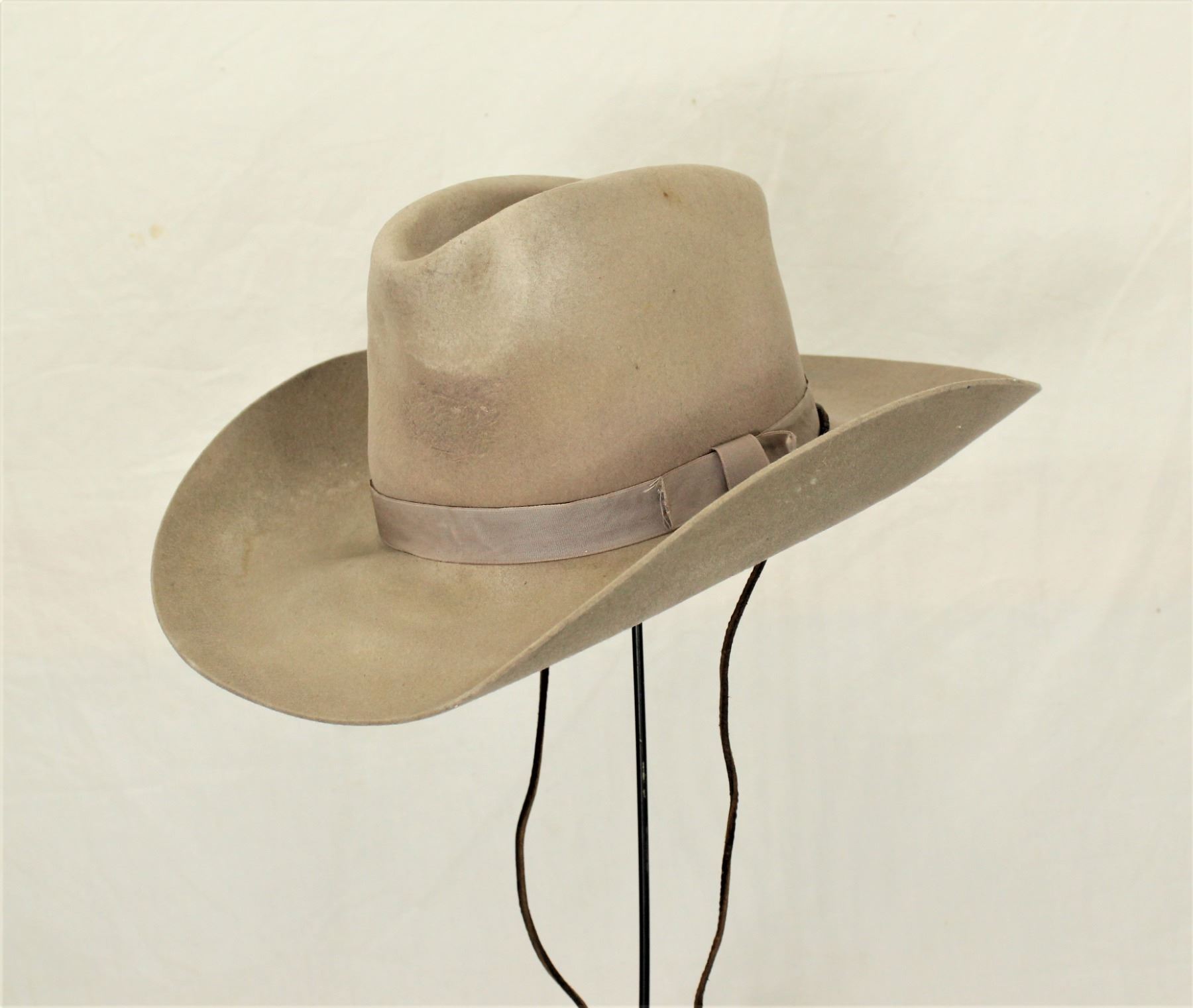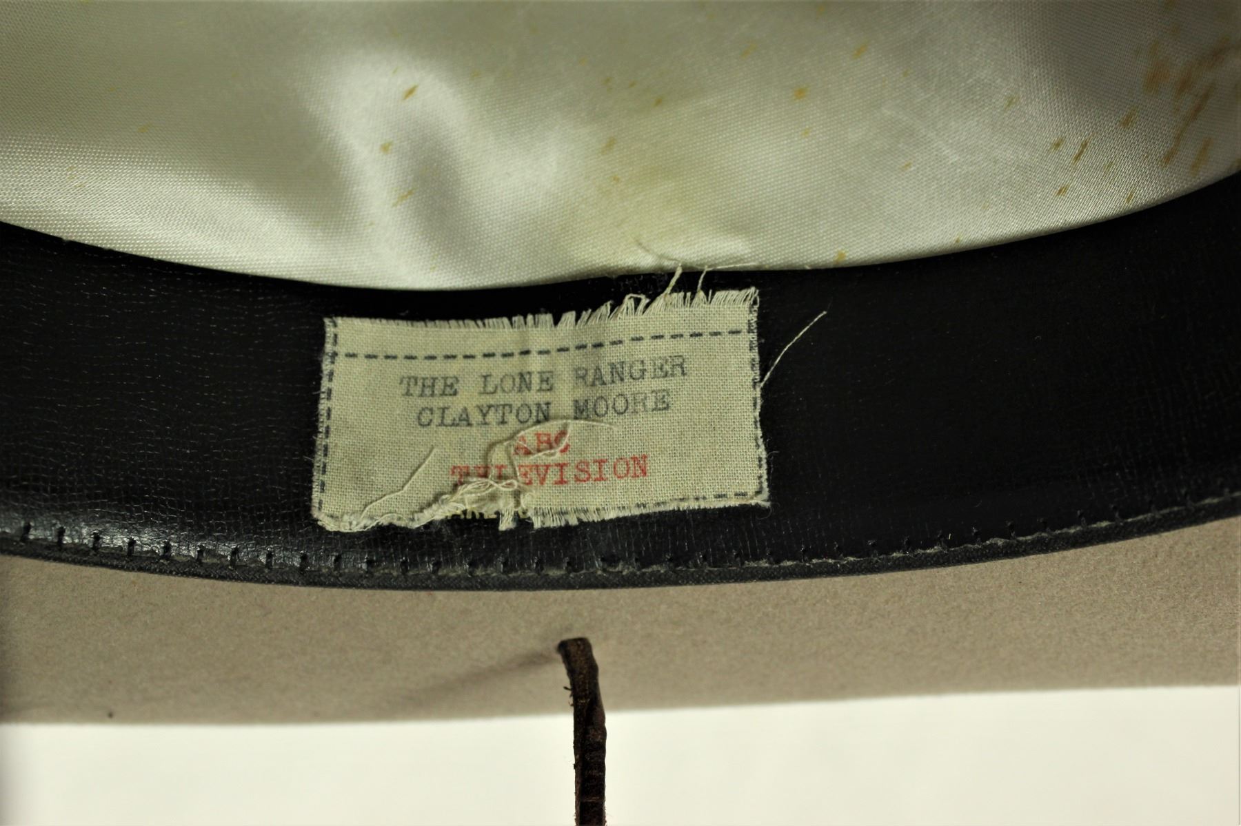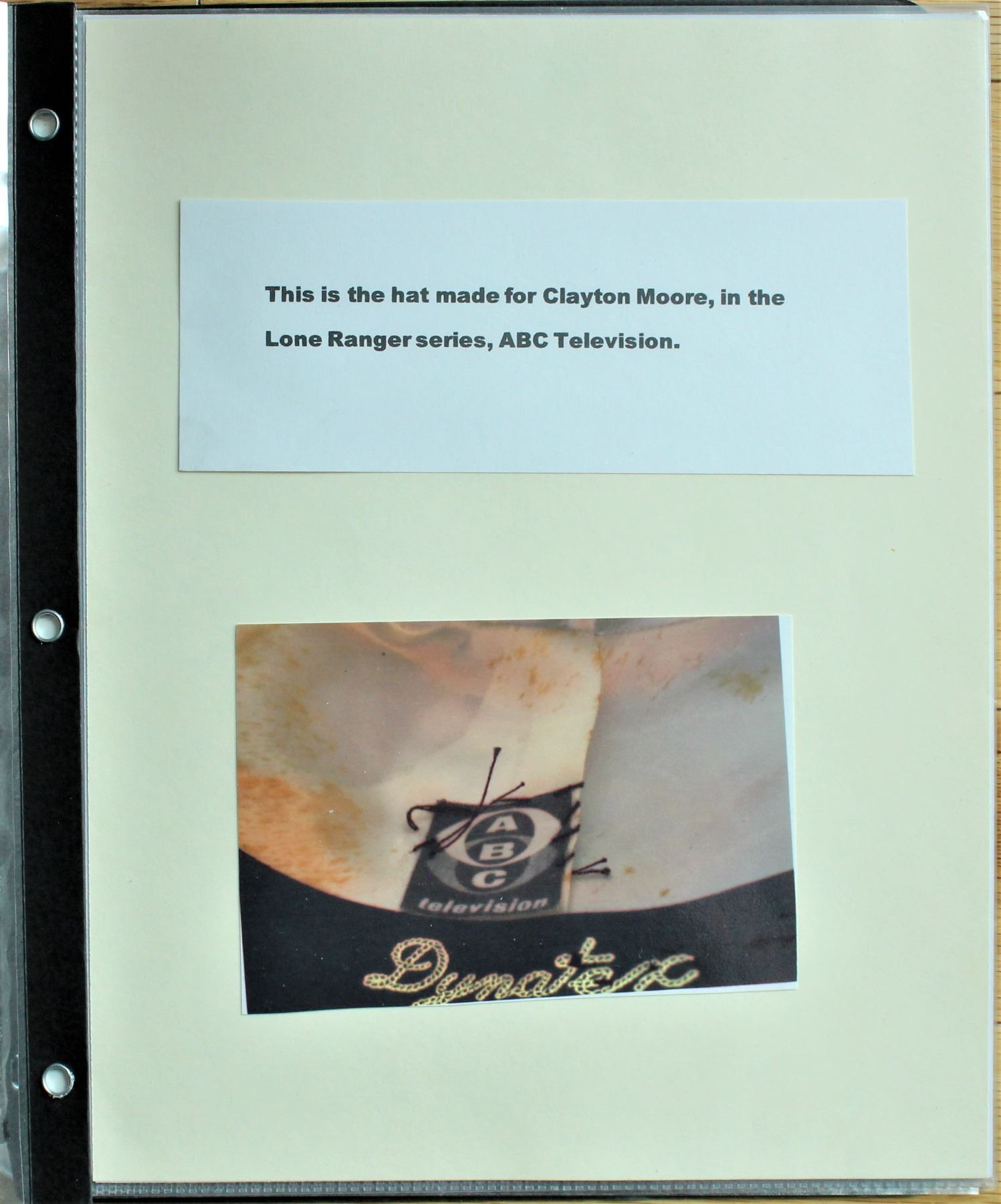 An interesting Dynatex brand hat wearing leather stampede string, with ABC Production studio label in sweatband stating "The Lone Ranger, Clayton Moore, ABC Television" along with another label on opposite side stating "ABC Television". This hat being made for Moore is authenticated and documented in the included portfolio and affidavit by Boyd Magers.
