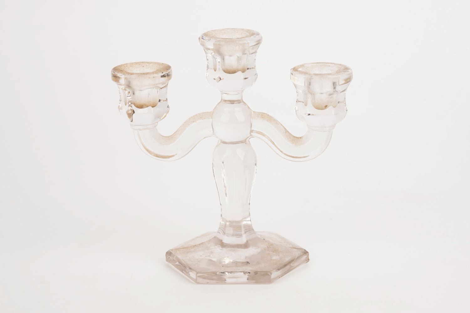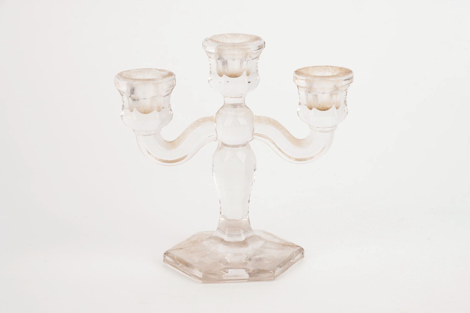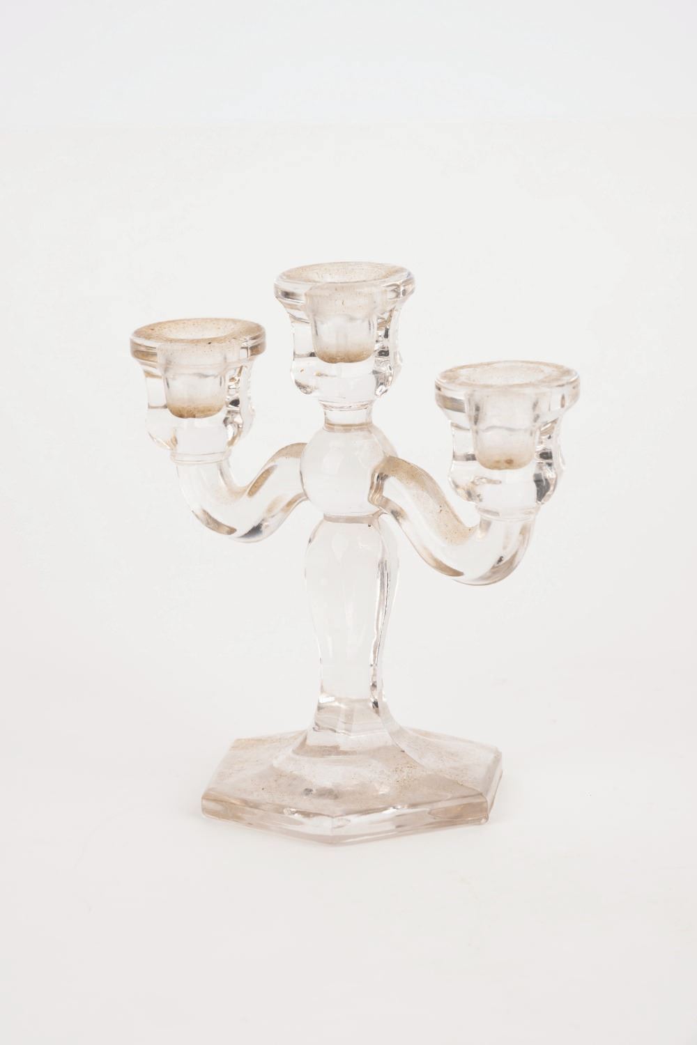 (Clint Eastwood, 1980s-2000s) A small glass candelabra from the estate of Academy Award-winner Clint Eastwood. Measuring 4.5” x 4.5”, the candelabra is in good condition with stains, residue, and wear from use.