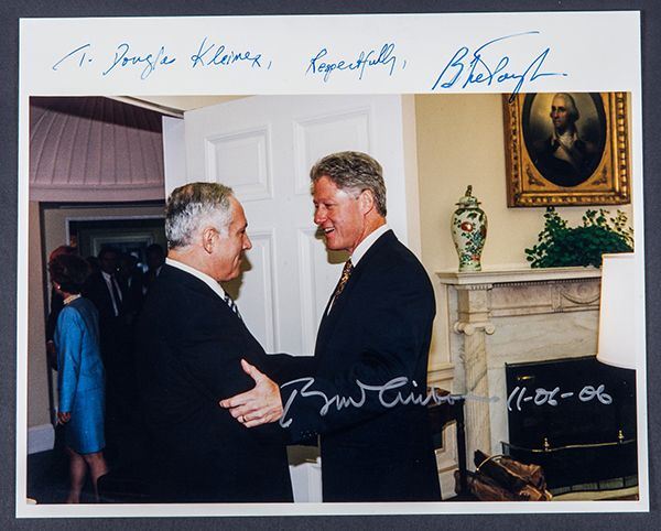 Clinton, Bill & Benjamin Netanyahu. 8 x 10 in. color photo of President Clinton and Israeli Prime Minister Netanyahu shaking hands in the White House on 9 July 1996, inscribed to Douglas Kleimer and signed "B. Netanyahu", n.d. and "Bill Clinton 11-06-06." Official White House Photograph stamp on verso. Netanyahu signed with a blue marker and Clinton with a silver marker. Clinton (1946 -)) was the 43rd President of the United States (1993-2001). Netanyahu (1949 -) is the current Prime Minister of Israel; he also served from 1996-99.