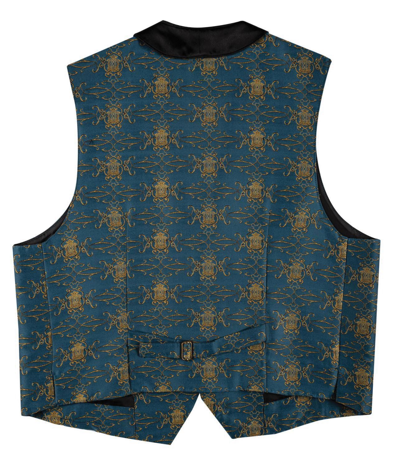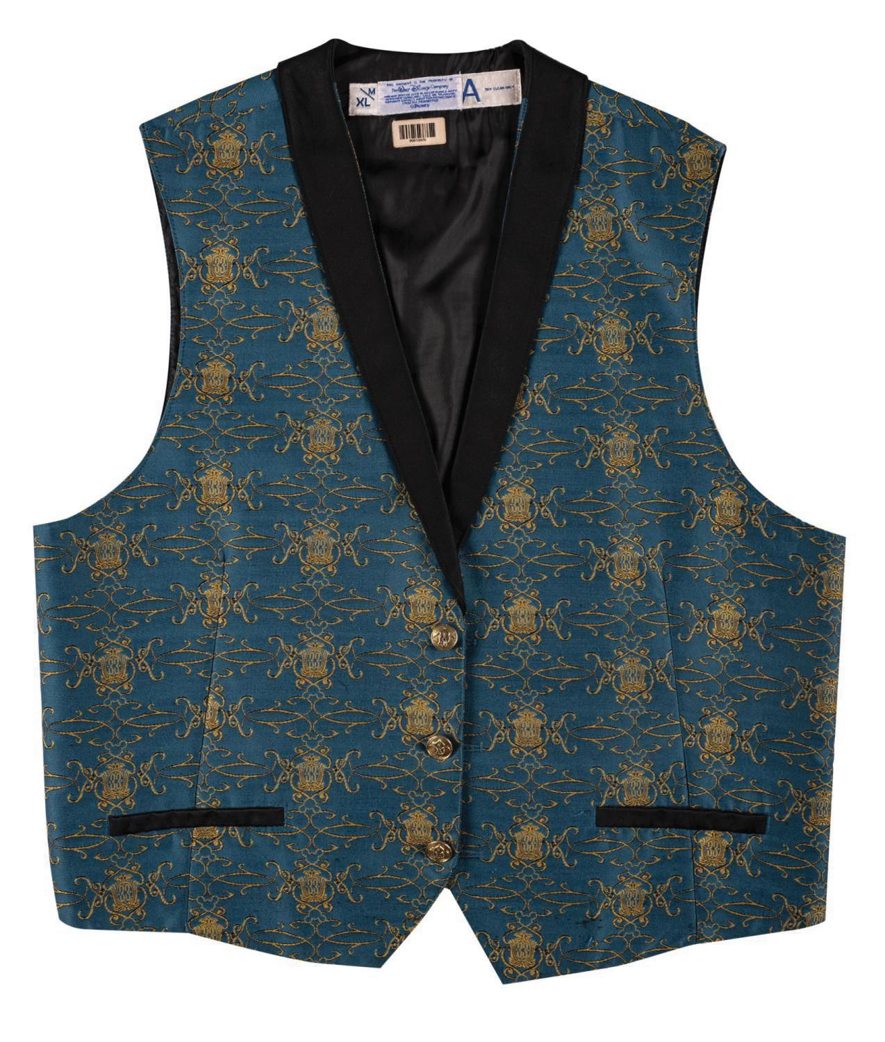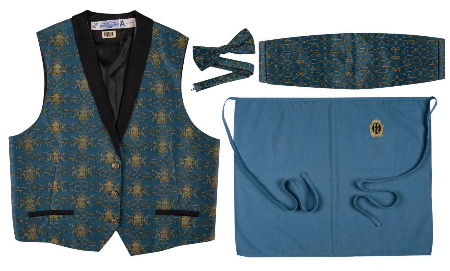 (Disneyland, c.2000s) A 4-piece wardrobe set once worn by Disneyland Cast Members of the Club 33 Members Only Lounge at Disneyland. The set features a vest, cummerbund, bowtie, and apron, sporting the fanciful Club 33 motif. The vest is accented by shiny gold-patina buttons bearing the wrought iron Walt Disney monogram, while the apron displays the embroidered logo of Club 33. Measuring "one size fits all," the condition is very fine, exhibiting the lightest wear from use, and retaining original Walt Disney Company Wardrobe labels.