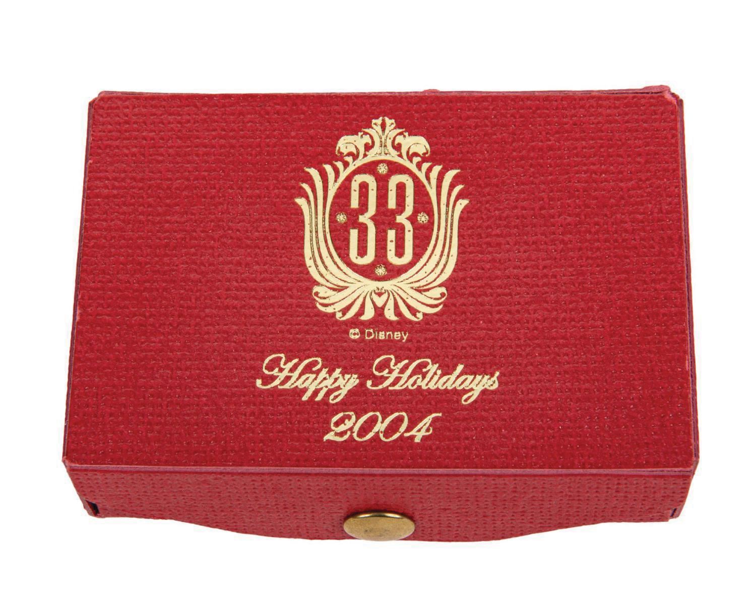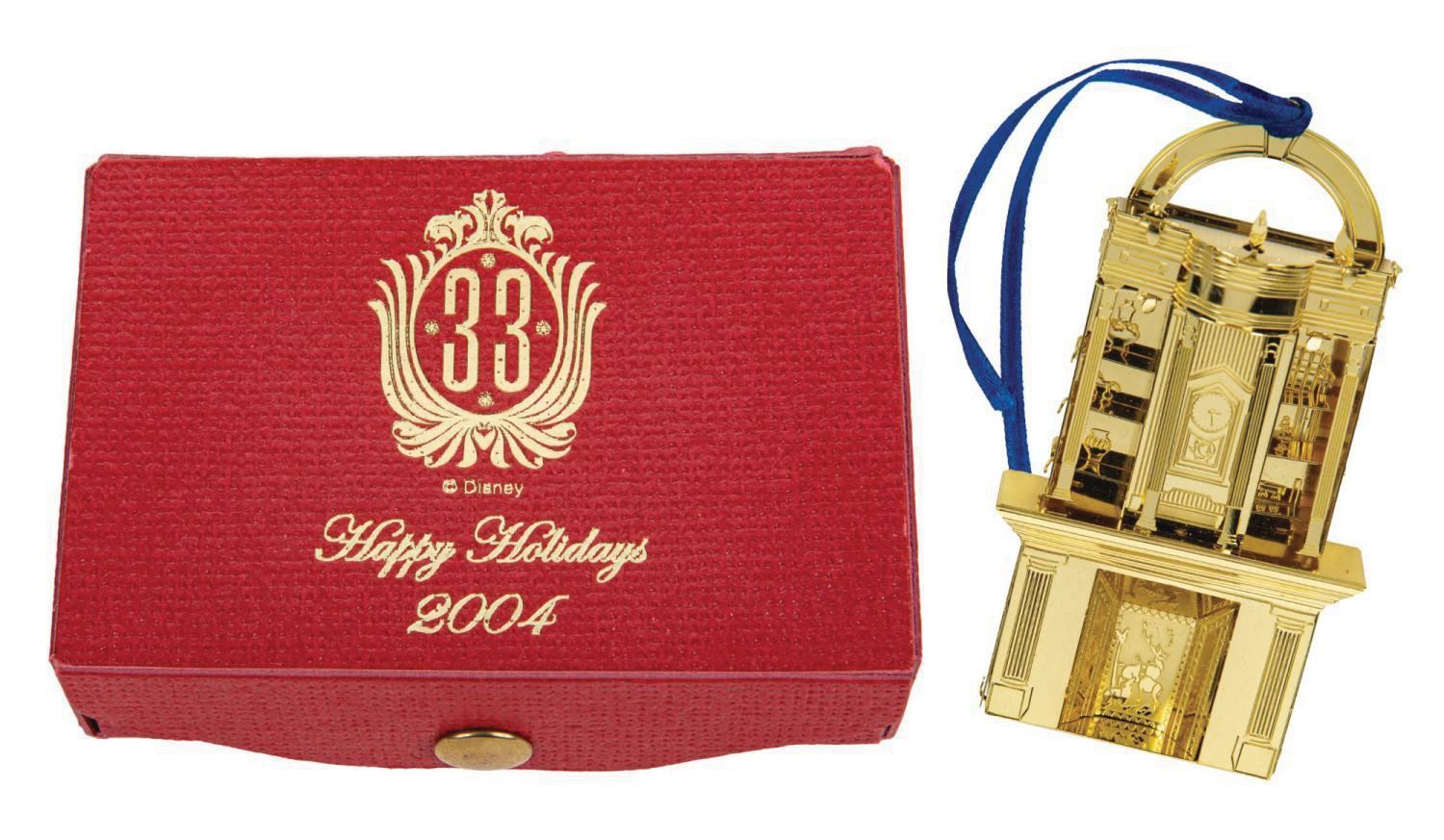 (Disneyland, 2004) A holiday ornament depicting the original Club 33 Trophy Room case. Recreated in lustrous metal for a Club 33 Members Only Holiday Gift in 2004. Measuring 3"x1.75" and under 0.5" wide, the gold-plated metal keepsake is in fine condition, and comes packaged in its fine condition 4.25"x2.75" and 1.25" red matt textured "Happy Holidays" box, bearing a button snap and Club 33 logo.